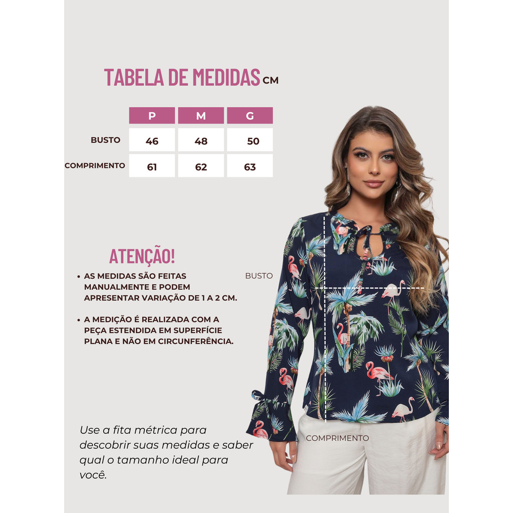 SEJA BEM-VINDO(A) À LOJA ONLYONE! Moderna, elegante e com um toque tropical sofisticado. Blusa feminina confeccionada em tecido leve 100% poliéster, com excelente caimento e toque suave. O modelo possui estampa tropical de flamingos e folhagens, trazendo charme e personalidade para o visual. Conta com decote com abertura frontal e detalhe de amarração, que valoriza o colo com delicadeza. As mangas longas com leve abertura/flare e detalhe de laço nos punhos acrescentam feminilidade e movimento à peça, deixando o look ainda mais sofisticado. Versátil e estilosa, é perfeita para compor produções para trabalho, eventos, jantares, cultos e ocasiões especiais, combinando facilmente com calças de alfaiataria, saias ou jeans para um visual casual chic. CARACTERÍSTICAS • Blusa feminina • Estampa tropical flamingo • Fundo azul marinho • Tecido leve e confortável • Decote com abertura frontal • Detalhe de amarração no colo • Mangas longas com leve flare • Laço nos punhos • Modelagem confortável • Excelente caimento • Não transparente (em condições normais de uso) CONTEÚDO DA EMBALAGEM 1x Blusa Feminina COMPOSIÇÃO DO TECIDO 100% Poliéster CUIDADOS COM A PEÇA Para maior durabilidade, siga corretamente as instruções: • Lavar até 30°C • Não usar alvejante à base de cloro • Não utilizar secadora • Secar à sombra • Passar até 110°C INFORMAÇÕES DE TAMANHO As medidas são feitas manualmente e podem apresentar variação de 1 a 2 cm. Consulte a tabela de medidas disponível no anúncio antes da compra. A medição é realizada com a peça estendida em superfície plana. PERGUNTAS FREQUENTES • Prazo de envio: O pedido é preparado e postado em até 1 dia útil após a confirmação da compra. • O produto é igual ao anúncio? Sim. As fotos são reais do produto. • O tecido esquenta? Não. O tecido é leve e confortável. • A estampa desbota? Não solta tinta quando seguidas corretamente as instruções de lavagem. INFORMAÇÕES ADICIONAIS • Produto novo • Pronta entrega • Envio pela transportadora parceira da plataforma • Compra segura pela plataforma Um toque tropical elegante para destacar sua produção em qualquer ocasião! Boas compras!