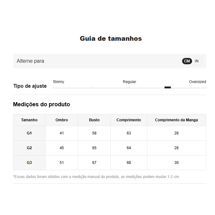 OLÁ, SEJA BEM-VINDO(A) A ONLYONE. ❤️ PEÇAS EXCLUSIVAS PARA MULHERES AUTÊNTICAS! BLUSA COM CAIMENTO SOLTO E FLUÍDO, CONTÉM A MANGA PRINCESA DANDO UM CHARME E DELICADESA. FABRICADO NO DUNAS DE TEXTURA ONDULADA NO QUAL NÃO HÁ NECESSIDADE DE PASSAR, TECIDO LEVE E PENSADO ESPECIALMENTE NA SENSAÇÃO DE FRESCOR. IDEAL PARA COMPOR LOOKS CASUAIS E SOFISTICADOS. PACOTE INCLUI: 1x BLUSA COMPOSIÇÃO: 100% POLIÉSTER ⚠️ATENÇÃO ÀS FORMAS DE LAVAR⚠️ SUGERIMOS QUE SIGA CORRETAMENTE A ETIQUETA DE INSTRUÇÃO DE LAVAGEM, QUE NOS DIZEM ATRAVÉS DE SÍMBOLOS. ESSES CUIDADOS SÃO INDISPENSÁVEIS PARA EVITAR DANOS A SUA ROUPA. MODO DE LAVAGEM: LAVAR A MÃO OU A MÁQUINA EM TEMPERATURA MÁXIMA DE ATÉ 30° NÃO USAR ALVEJANTE A BASE DE CLORO. NÃO USAR A SECADORA. FERRO EM ATÉ 110°. NÃO PODE LAVAR A SECO. ATENÇÃO ÀS MEDIDAS: ESSAS MEDIDAS SÃO FEITAS MANUALMENTE COM FITA METRICA EM LINHA RETA E PODEM CONTER MARGENS DE ERROS DE 1 A 2 CM. A MEDIDA NÃO É FEITO EM CIRCUNFERÊNCIA! TAMANHO G1 OMBRO: 41 CM. BUSTO: 58 CM. COMPRIMENTO: 63 CM. TAMANHO G2 OMBRO: 45 CM. BUSTO: 64 CM. COMPRIMENTO: 65 CM. TAMANHO G3 OMBRO: 50 CM. BUSTO: 66 CM. COMPRIMENTO: 69 CM. COMO CONFERIR AS MEDIDAS? CLICK EM -> TAMANHO E AJUSTE -> MAIS INFORMAÇOES DE TAMANHO. NA TABELA DE MEDIÇÃO DO PRODUTO, ESTÁ EXPLICANDO A FORMA CORRETA DE COMO SE MEDIR A PEÇA EM CASA COM UMA FITA MÉTRICA. INFORMAÇÕES ADICIONAIS. ENVIO RAPIDO E SEGURO. SEU PEDIDO SERÁ PREPARADO E POSTADO EM ATÉ UM DIA ÚTIL. NÃO SOLTA TINTA, E PARA NÃO HAVER RISCO DE DESBOTAR PEDIMOS QUE SIGA CORRETAMENTE O MODO DE LAVAGEM. NOSSOS LOOKS SÃO EXATAMENTE COMO O ANÚNCIO, NOSSAS FOTOS SÃO EXCLUSIVAS. A NOSSA EQUIPE AGRADECE E DESEJA BOAS COMPRAS. ❤️