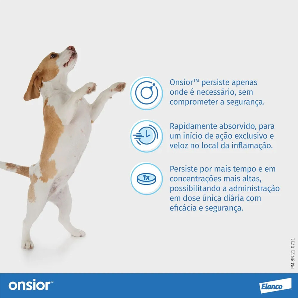 A nossa loja está a mais de 10 anos no mercado, com produtos originais e com nota fiscal. ________________________________________________________________ ONSIOR 10MG – ANTI-INFLAMATÓRIO PARA CÃES | 7 COMPRIMIDOS PALATÁVEIS O Onsior 10mg é um anti-inflamatório não esteroide indicado para o tratamento da dor e inflamações em cães a partir de 3 meses de idade e com peso superior a 2,5kg. Sua fórmula com Robenacoxibe oferece alívio rápido e eficaz, com comprimidos palatáveis de fácil administração. INFORMAÇÕES EM TÓPICOS: - Indicado para o alívio da dor e inflamações, como a osteoartrite - Auxilia na recuperação de cirurgias em tecidos moles - Comprimidos palatáveis, fáceis de administrar - Administração oral: 1 comprimido diário para cães de até 10kg - Uso indicado por até 14 dias, conforme orientação veterinária - Não administrar junto com alimentos (intervalo de 30 minutos antes ou depois das refeições) ESPECIFICAÇÕES: - Composição: Robenacoxibe - Modo de aplicação: Oral - Apresentação: Embalagem com 7 comprimidos - Indicação: Cães (a partir de 3 meses e com mais de 2,5kg) - Marca: Onsior - Idade: Filhote, Adulto, Sênior - Gênero: Unissex CONTRAINDICAÇÕES: - Não indicado para cães com menos de 2,5kg ou com menos de 3 meses - Contraindicado para animais com úlceras gastrointestinais ou doenças hepáticas - Não utilizar com outros anti-inflamatórios não esteroides (AINEs) ou corticosteroides - Não administrar a animais gestantes ou lactantes - Contraindicado em casos de hipersensibilidade ao princípio ativo POSSÍVEIS EFEITOS COLATERAIS: - Vômitos - Diarreia - Apatia - Alterações nas fezes - Falta de apetite ou anorexia Com formulação segura e eficiente, Onsior 10mg é ideal para tratar dores e inflamações em cães, proporcionando mais conforto e bem-estar ao seu pet. Consulte sempre o médico-veterinário antes do uso e siga as orientações de tratamento corretamente. ________________________________________________________________ Gostou? Não perca tempo, garanta já o seu!