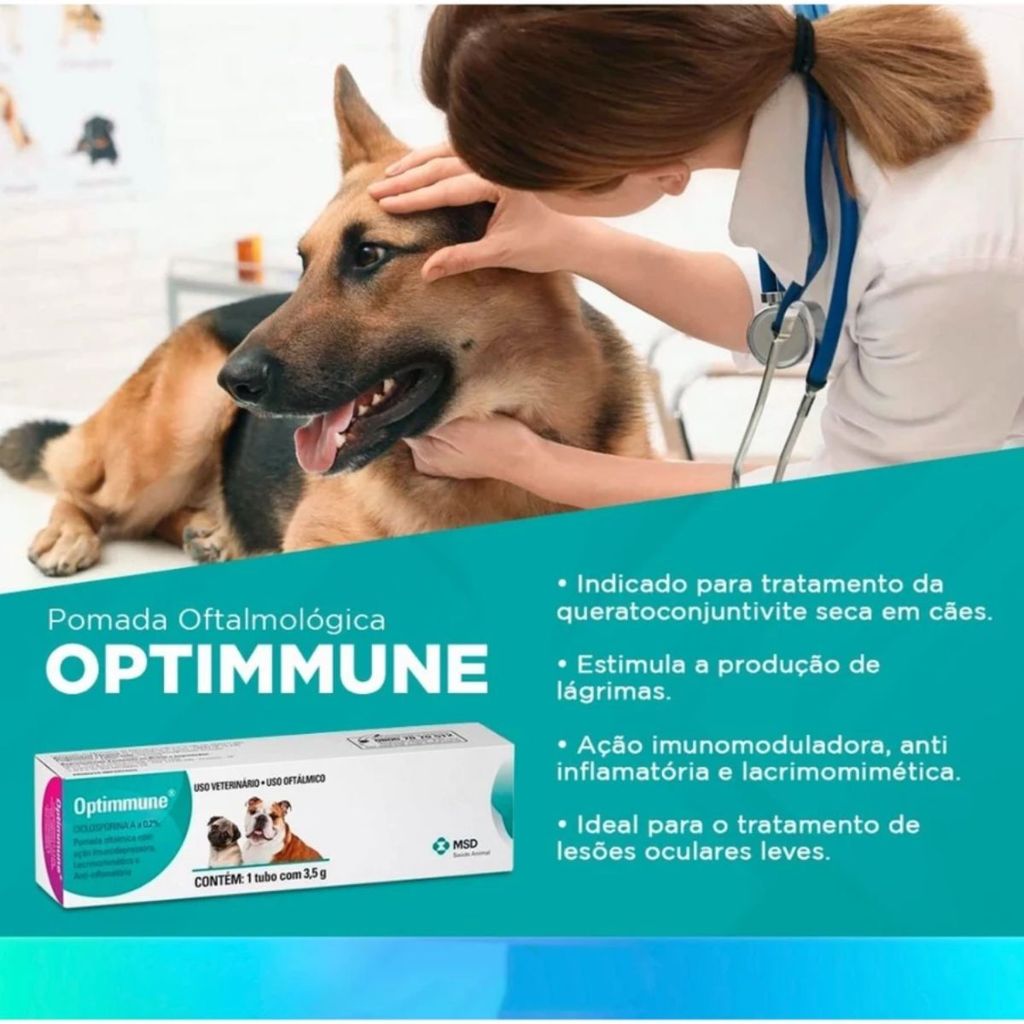 A MANADA ANIMAL é um marketplace de produtos veterinários. É a escolha certa para tutores que prezam pela qualidade dos produtos que seu animal necessita. Tudo com o suporte de uma equipe de veterinários e gestores com mais de 10 anos de experiência no mercado. Fique tranquilo, todos os nossos produtos são originais, adquiridos através de distribuidores credenciados! Ah, e todas as vendas acompanham nota fiscal! MANADA ANIMAL, Tranquilidade pra você, cuidado para ele! _________________________________ IndicaçoesO tratamento baseia-se no controle das causas primárias da patologia, prevenindo a deterioração contínua das glândulas lacrimais e consequentemente progressão da doença.OPTIMMUNE, por ser imunodepressor não citotóxico que apresenta atividades lacrimomimética e antiinflamatória, está indicada no tratamento da Queratoconjuntivite seca em cães.Posologia e mode de usarApós a remoção de eventuais crostas com solução não irritante adequada, aplicar no saco conjuntival inferior do olho afetado, uma tira de pomada de aproximadamente 1 cm de comprimento.Optimmune deve ser administrado duas vezes ao dia, com um intervalo de 12 h entre cada aplicação. Devido ao caráter crônico e idiopático da enfermidade, a duração do tratamento deve ser estabelecida pelo Médico Veterinário.Efeitos colateraisUma leve irritação local pode ocorrer nos primeiros dias do tratamento.Contra-indicaçõesNão é recomendado o uso de produto em fêmeas gestantes ou em lactação.ApresentaçãoTubo de alumínio de 3,5 g, com tampa e ponta dosadora em plásticoComposiçãoCada 3,5 g contém:Ciclosporina A ............................................................................................................. 7,0 mgExcipiente q.s.p. ............................................................................................................. 3,5 g
