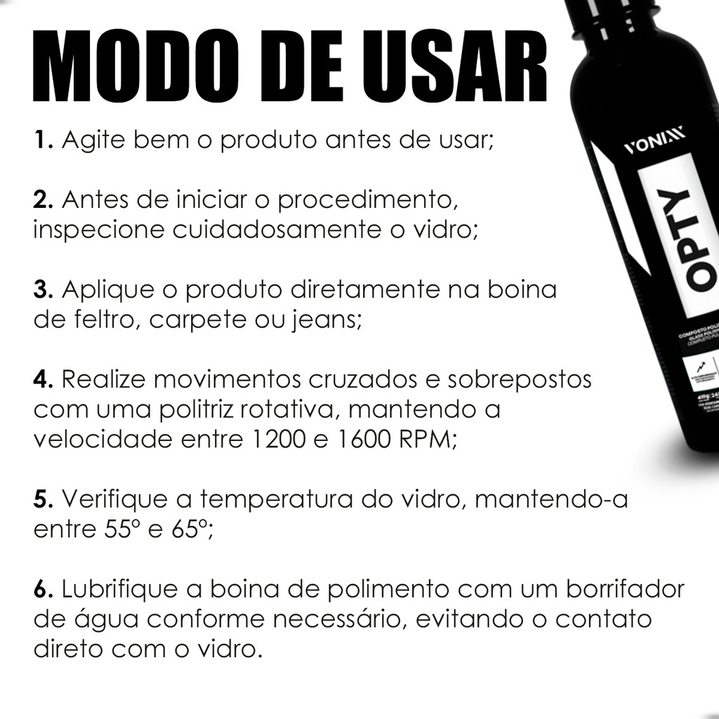 >>>>>>COMPOSTO POLIDOR PARA VIDROS OPTY 240ML VONIXX<<<<<< Conteúdo da Embalagem: 01 (Um) Composto Polidor para Vidros; Opty 240ml Vonixx; **Imagens e vídeo do anúncio são reais. OPTY é um composto polidor de alta performance formulado exclusivamente para o polimento de vidros. O produto atua na remoção de arranhões, riscos superficiais, riscos de palhetas e marcas dágua de vidros em geral. MODO DE USO: 1. Agite bem o produto antes de usar. 2. Antes de iniciar o procedimento, inspecione cuidadosamente o vidro. Caso haja algum tipo de avaria, como rachaduras, trincas ou batidas profundas de pedras, não realize o polimento. 3. É de fundamental importância que o vidro esteja limpo e descontaminado com Prizm Vonixx. 4. Aplique o produto diretamente na boina de feltro, carpete ou jeans. 5. Realize movimentos cruzados e sobrepostos com uma politriz rotativa, mantendo a velocidade entre 1200 e 1600 RPM. 6. Verifique a temperatura do vidro, mantendo-a entre 55º e 65º. 7. Lubrifique a boina de polimento com um borrifador de água conforme necessário, evitando o contato direto com o vidro.