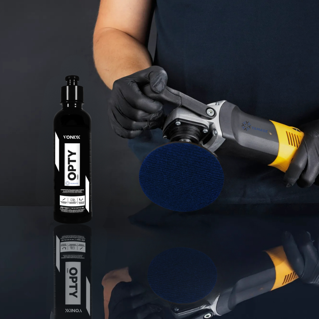Opty Polidor de Vidros Para-Brisa + Limpa Vidro 500ml + Boinas de Polimento Lona Carpete