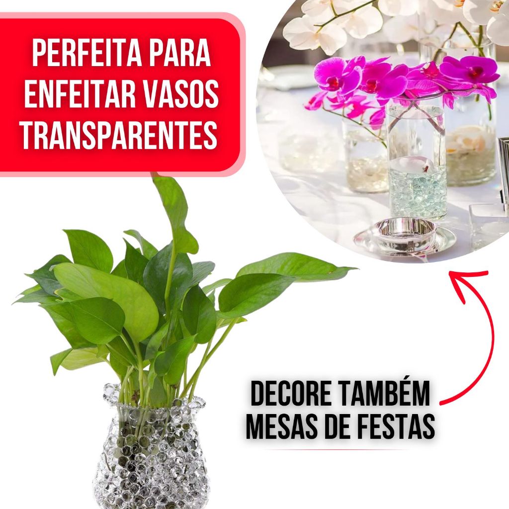ORBIS BOLINHAS DE GEL CRESCE NA ÁGUA 4000 UNDS TRANSPARENTE Kit com 24 pacotinhos de Bolinhas de gel para plantas que cresce na água transparente. As Bolinhas de Gel são muito usadas para decorar vasos e arranjos de flores em casa ou em festas e eventos. São muito usadas também em vasos com velas e para decorar vasos de plantas artificiais, mas podem ser usadas em vasos com flores de verdade, mantendo-as hidratadas e evitando o excesso de água parada, impedindo a proliferação de mosquitos como o da dengue. Basta colocar as bolinhas na água e aguardar de 3 a 4 horas para que elas suguem a água e cresçam ficando lindas e brilhantes! Aí é só decorar seus vasinhos do jeito que você quiser! Após alguns dias em que as bolinhas começarem a diminuir, basta colocar mais um pouco de água e elas voltarão a crescer novamente. CADA SAQUINHO DE 4 g TEM EM MÉDIA 145 BOLINHAS (TOTALIZANDO 4.000 BOLINHAS NO KIT COM 24 SAQUINHOS) COM AS BOLINHAS EXPANDIDAS, CADA SAQUINHO PREENCHE EM MÉDIA UM ESPAÇO DE 320 ML. (Um copo de Requeijão) Uma simples decoração com essas bolinhas de gel traz ALEGRIA a qualquer ambiente! Após as bolinhas se expandirem, elas atingem o tamanho de 1 a 1,7 cm.