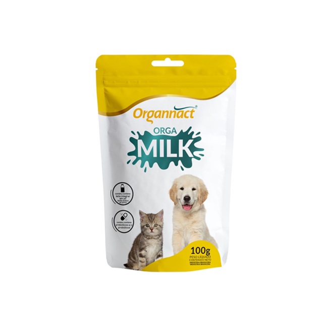 Orga Milk Leite Suplemento Para Cães E Gatos Filhotes 100g VALIDADE: Março de 2027 Suplemento vitamínico mineral aminoácido indicado para filhotes de cães e gatos que necessitam de suporte nutricional na fase de amamentação até o desmame. Contém níveis adequados de proteínas e vitaminas para um equilíbrio nutricional desde os primeiros dias da vida. COMPOSIÇÃO BÁSICA DO PRODUTO: Leite integral em pó (10,50%), permeado de soro de leite desidratado, calcáreo calcítico, ovo em pó, farinha de arroz, ferro aminoácido quelato, inulina, parede celular de levedura, Bacillus subtilis (CCT 0089), Bifidobacterium bifidum (DSM 20456), Enterococcus faecium (CCT 6646), Lactobacillus acidophilus (CCT 2949), Lactobacillus casei (CCT 1465), Lactobacillus lactis (CCT 1344), ácido fólico, ácido pantotênico, biotina, cloreto de colina, niacina, vitamina A, vitamina B1, vitamina B2, vitamina B6, vitamina B12, vitamina C, vitamina D3, vitamina E, vitamina K3, sulfato de ferro, cobre aminoácido quelato, iodato de cálcio, manganês aminoácido quelato, proteinato de selênio, zinco aminoácido quelato, glutamina, carbonato de sódio, carbonato de cálcio, sucralose, aroma baunilha, B.H.T. (hidróxido de tolueno butilado). MODO DE USAR: Fornecer diariamente por via oral. Diluir 8g em 40ml de água a 34ºC. Embalagem contendo colher dosadora de 8 g. (Uma vez diluído, deve ser mantido refrigerado e consumido em 24h). ORIENTAÇÕES: - Não substitui o primeiro leite da mãe (colostro); - Recomendamos utilizar após o segundo dia de vida; - É muito importante que o produto seja oferecido em porções pequenas, várias vezes ao dia, permitindo que os animais façam uma boa digestão; - Não armazenar o produto diluído (versão liquida) por mais de um dia; - Deve sempre ser preparado fresco, e aquecido a cada administração. - Nunca fornecer frio. - Deve ser fornecido em mamadeira até pelo menos 1 mês de vida. A partir daí é possível treinar os filhotes a lamberem o produto em um prato. - Evitar seringas, pois jatos podem acabar entrando na traqueia e causar pneumonia. - Em caso de diarreia, suspender o fornecimento por pelo menos 6 horas. Nesse período, fornecer somente fluido hidratante. Quando voltar com o Orgamilk, oferecer quantidades pequenas, menores do que as anteriores.