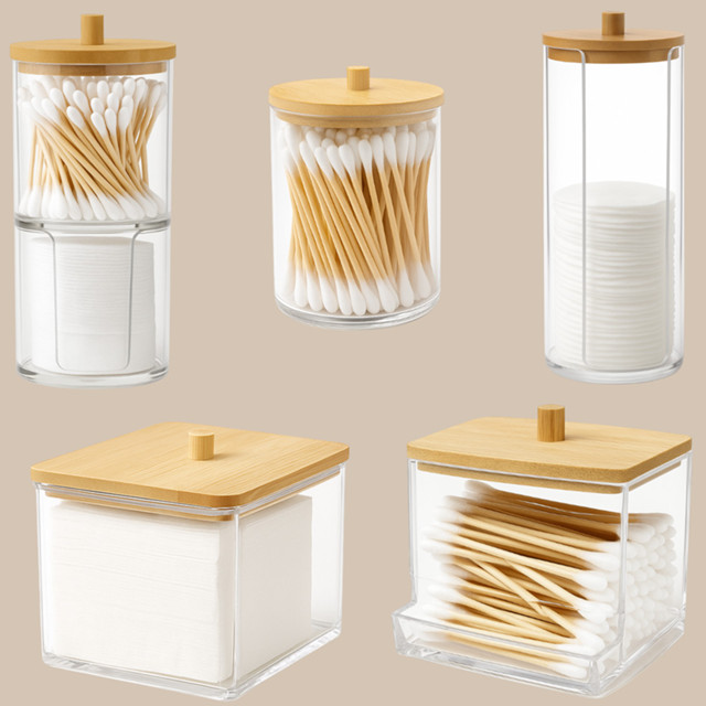 Organizador Acrílico Com Tampa De Bambu Penteadeira Algodão Cotonete Armazenamento Joias Cilios