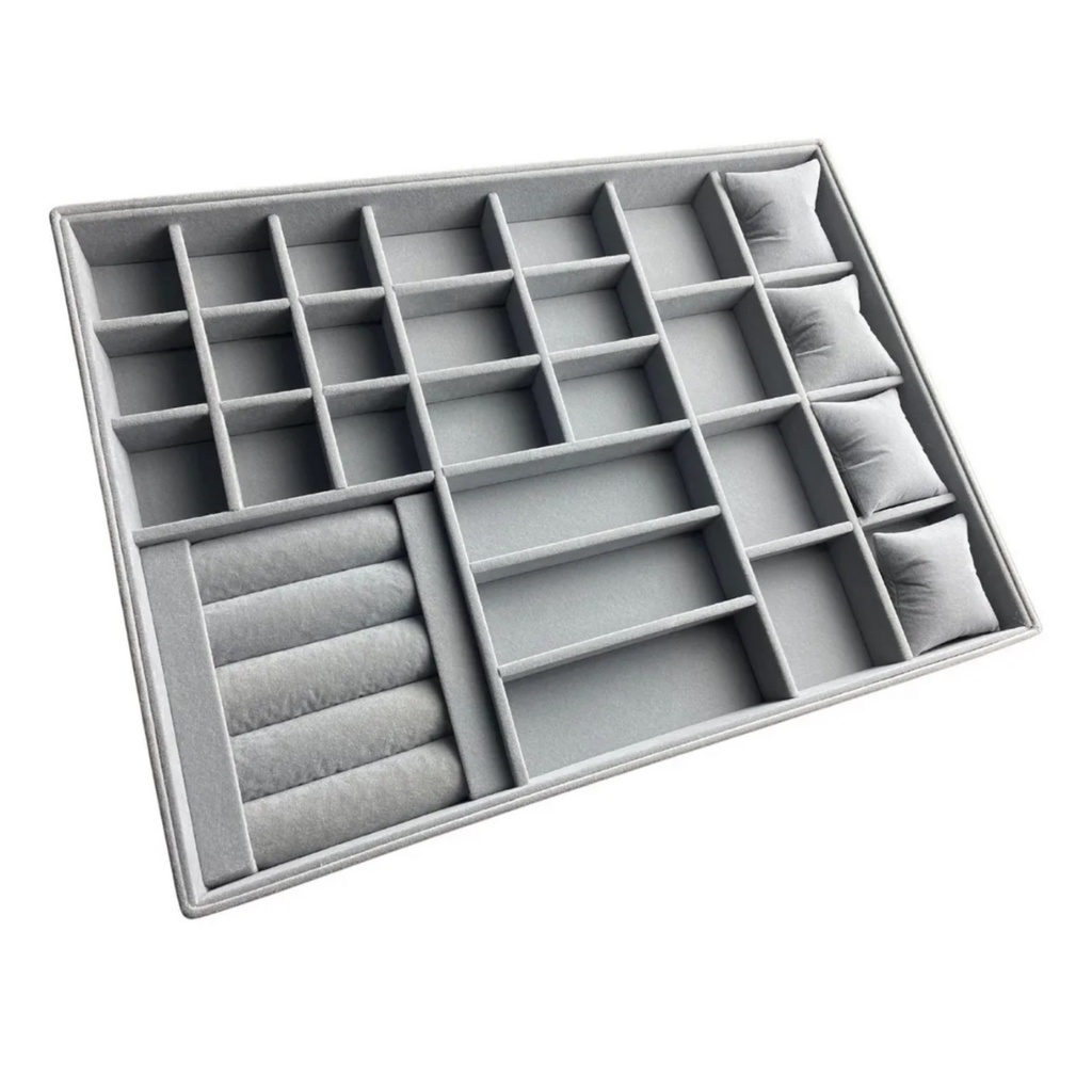 Eu sei, você tá cansada de abrir a gaveta e ficar maluca com aquela bagunça danada...eu tô aqui pra te ajudar, miga! Quem eu sou? Hummm...muito prazer, sou o organizador porta joias para gavetas (ou onde você quiser me colocar rs), fui pensado e fabricado por uma empresa com mais de 10 anos de experiência no desenvolvimento de soluções sob medida! Sou fabricado em material composto de madeira e celulose, sou verde, green, amigo do meu ambiente ou outro nome mais cool que já deram e eu to por fora da trend rsrsrs Vai ficar ai de bobeira? Me abraça e me chama deu seu!!!! Características do produto: Estrutura produzida em material composto de alta resistência Forro em suede liso premium, o melhor disponível no mercado Dimensões: Tamanho P: 30x30x4cm Tamanho G: 48x35x5cm 22 nichos fixos, contando o berço para anéis.