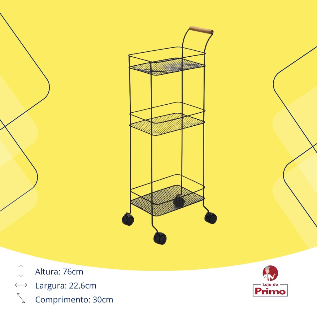 Organizador Carrinho Multiuso Auxiliar 3 Andares Rodinha Rodizio Preto Eco Design Arthi