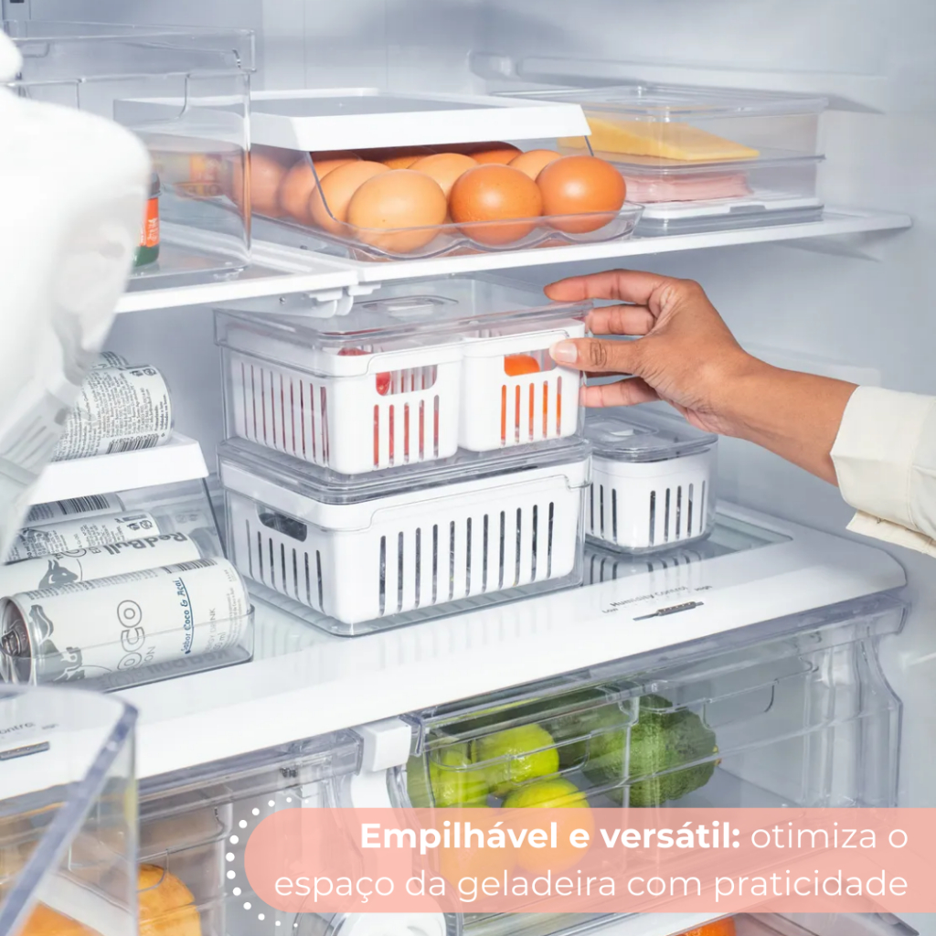 SOBRE O PRODUTO O organizador de geladeira Clear Fresh com cesto duplo 2,2L promove frescor prolongado para os alimentos, para uma rotina mais saudável e sem desperdícios. O sistema de ventilação mantém o nível de umidade ideal para cada alimento. A armazenagem com cestos evita que as frutas, verduras e legumes fiquem molhados após a lavagem, aumentando a durabilidade dos alimentos. Sinta o frescor de uma vida leve, saudável e organizada. Sua transparência facilita a visualização dos alimentos e a organização do ambiente. Produzido em material resistente (PS Transparente), o organizador garante durabilidade, praticidade e fácil higienização. Transparência, beleza e cuidado com o alimento são características da linha Clear Fresh, perfeitas para auxiliar na organização da sua geladeira e facilitar o seu dia a dia." CUIDADOS Este produto é BPA Free, não deve ser levado ao freezer, lava louças e ao microondas. Sugere-se higienizar o mesmo com sabão neutro e esponja macia, evitando produtos abrasivos no processo de limpeza. ITENS INCLUSOS: 01 Organizador de Geladeira Acrílico com Tampa. 02 Cesto de Drenagem Removível. ESPECIFICAÇÕES Material: Acrílico. Cor: Transparente. Capacidade: 2,2 Litros. Dimensões: 20cm (Comprimento) x 15cm (Largura) x 9,5cm (Altura).