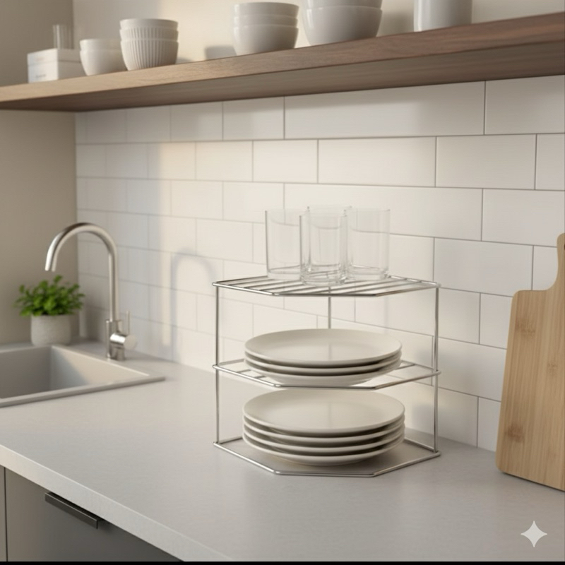 Organizador De Canto Triplo Reforçado Para Armário De Cozinha Otimize cada centímetro do seu armário com o Suporte de Canto Triplo. Desenvolvido para facilitar a categorização de itens, este organizador é ideal para pratos de diferentes tamanhos, xícaras ou até mantimentos, evitando o empilhamento excessivo que pode danificar suas peças. Altura: 22 cm Largura: 26 cm Comprimento 26 cm