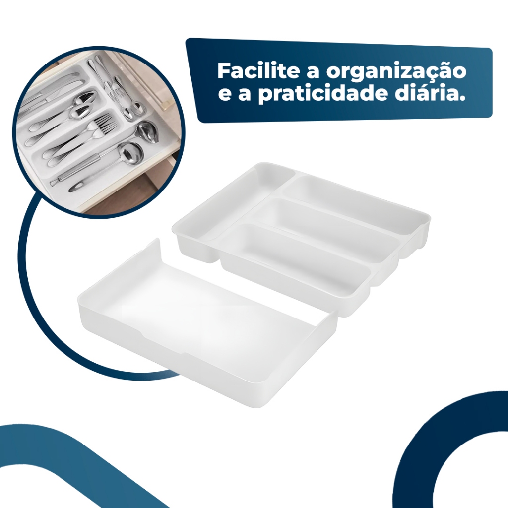 Se você quer uma gaveta organizada, esse organizador de gavetas é ideal para isso. O organizador de talheres da Arthi tem divisórias que permitem a organização exata de cada tipo de talher, deixando o seu dia a dia muito mais prático. São 4 compartimentos mais a extensão ajustável que você posiciona conforme a sua necessidade que proporcionará uma melhor organização, deixando mais simples e prático aonde quer que seja usado. O extensor serve para garantir que o produto se adeque a diferentes tamanhos de gavetas e necessidades. O uso do extensor é opcional. Dimensões: Medidas externas: Parte fixa: 25 x 33 x 5,5cm (CxLxA) Extensor: 22,5 x 33 x 5,5cm (CxLxA) Medidas dos compartimentos internos: - 4 de 24cm por 8 cm - Parte extensível: 22,5 cm por 33 cm Composição: PP Funções: Organizador De Gaveta Para Cozinha Organizador De Gaveta Para Utensílios Organizador De Gaveta Para Talheres Organizador De Gaveta Banheiro Organizador De Gaveta Escritório Limpeza: Para manter a qualidade do produto use espoja macia e detergente neutro. Não utilize abrasivos ou produtos químicos para limpeza. Evite odores residuais mantendo sempre limpo.