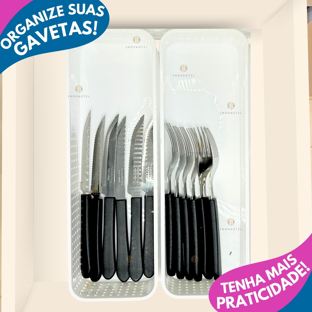 Organizadores versáteis para Gavetas, armários, estantes, closets, prateleiras, penteadeiras e muito mais, mantendo os hambientes mais organizados e funcionais. Organiza talheres e utensílios em seus devidos lugares, deixando muito mais organizado e facilitando na hora de procurar o que precisa, ideal também para gavetas e bancadas de Cosméticos e Maquiagens KIT COMPOSTO POR 2 PEÇAS (30x10x6) DISPONIVEL EM 2 CORES: PRETO E BRANCO BENEFÍCIOS - Seu design modular permite que ele seja empilhável - Use para organizar diversos objetos - Pode ser usados sobrepostos ou lado a lado CARACTERÍSTICAS Material: Polipropileno Peso Aproximado: 133g Altura: 6cm Largura: 10cm Comprimento: 30cm ____________________________ - Trabalhamos sempre com as fotos reais dos produtos. - Garantimos a qualidade de nossos produtos, entrega e satisfação do cliente. Em caso de qualquer dano ou quebra no transporte resolveremos o mais breve possível sem nenhum custo adicional. ____________________________ PERGUNTAS FREQUENTES: Produto a pronta entrega? Qual o prazo de envio? R: Sim, nossos produtos estão todos em estoque próprio, comprando agora enviaremos até o próximo dia util. Enviam nota fiscal? R: Enviamos todos os nossos produtos com nota fiscal.