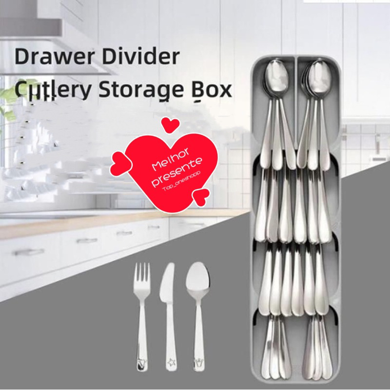 Organizador De Gaveta Talheres Separação Garfo Faca Colher Descrição: Valorize sua decoração com o organizador de gavetas. Tenha praticidade na hora de escolher o talher que deseja usar. É mais higiênico, saudável e fácil de lavar Especificações: Material: feito de 100% PP Material aprovado padrão FDA/LFGB Cor: Branco ou Cinza Medida: Separado talheres 39,8 x 11,4 x 5,8cm medida:Separado de faca 14.5cm*39cm*7.5cm