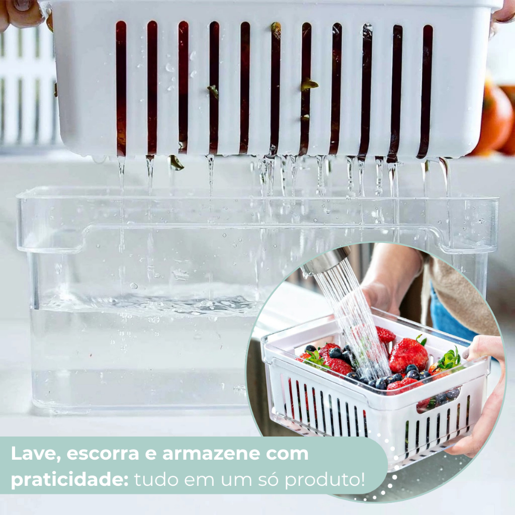 SOBRE O PRODUTO O Organizador De Geladeira 2,2 Litros Com Cesto Clear Fresh é o novo padrão de transparência na organização da sua geladeira. Empilhe, encaixe e enxergue facilmente os alimentos armazenados na geladeira, mantendo tudo em ordem. Seu design foi pensado para promover frescor prolongado para alimentos como: fruta, saladas, verduras e legumes mantendo uma rotina sem desperdícios. Super transparência, beleza e cuidado com o alimento são características da linha Clear Fresh, perfeitas para auxiliar na organização da sua geladeira e facilitar o seu dia a dia. CUIDADOS Este produto é BPA Free, não deve ser levado ao freezer, lava louças e ao microondas. Sugere-se higienizar o mesmo com sabão neutro e esponja macia, evitando produtos abrasivos no processo de limpeza. ITENS INCLUSOS: 01 Organizador de Geladeira Acrílico com Tampa. 01 Cesto de Drenagem Removível. ESPECIFICAÇÕES Material: Acrílico. Cor: Transparente. Capacidade: 2,2 Litros. Dimensões: 20cm (Comprimento) x 15cm (Largura) x 9,5cm (Altura).