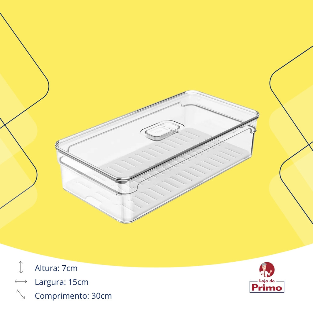 Organizador de Geladeira em Acrílico com Tampa 2,8 Litros - Clear Fresh OU Mantenha sua geladeira sempre organizada e seus alimentos protegidos com o Organizador de Geladeira em Acrílico Clear Fresh OU. Com design moderno e funcional, ele facilita a disposição dos mantimentos, evitando desperdícios e otimizando o espaço. Destaques do Produto: ✔ Material Transparente e Resistente: Feito em acrílico de alta qualidade, permitindo visualizar os alimentos com facilidade. ✔ Tampa Protetora: Mantém os alimentos protegidos de odores indesejados e preserva a organização da geladeira. ✔ Capacidade de 2,8 Litros: Ideal para armazenar frios, laticínios, frutas, vegetais e outros itens. ✔ Design Compacto e Funcional: Facilita o empilhamento e aproveita melhor o espaço interno da geladeira. ✔ Fácil de Limpar: Superfície lisa e resistente à umidade, garantindo praticidade no dia a dia. Dimensões: 📏 Altura: 7 cm 📏 Largura: 15 cm 📏 Comprimento: 30 cm Com o Organizador de Geladeira Clear Fresh OU, sua cozinha ganha mais praticidade, higiene e eficiência. Ideal para quem busca um ambiente mais organizado e funcional! 🥦🍓✨