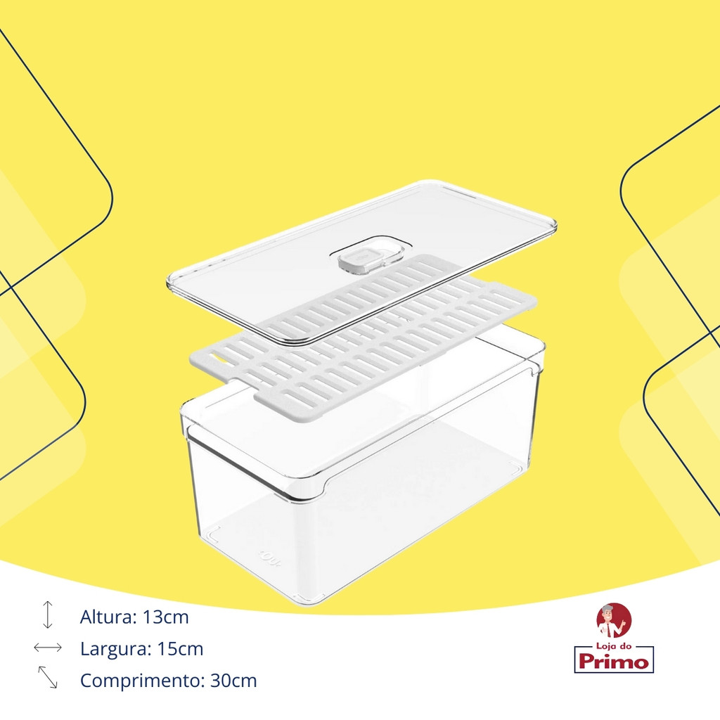 Organizador de Geladeira em Acrílico com Tampa - 5 Litros | Clear Fresh OU Mantenha sua geladeira sempre organizada e seus alimentos bem armazenados com o Organizador Clear Fresh OU. Com um design transparente e moderno, ele permite a visualização rápida dos itens armazenados, garantindo mais praticidade no dia a dia. Sua tampa protetora evita contaminações e odores indesejados, além de possibilitar o empilhamento para melhor aproveitamento do espaço. Características Principais: ✅ Capacidade de 5 litros – Ideal para armazenar frutas, verduras, frios, laticínios e outros alimentos. ✅ Tampa protetora – Mantém os alimentos protegidos contra umidade, odores e contaminações. ✅ Material resistente e durável – Produzido em PS (Poliestireno) e PP (Polipropileno), garantindo alta durabilidade e facilidade na limpeza. ✅ Design transparente – Facilita a visualização dos alimentos sem precisar abrir o organizador. ✅ Formato Empilhável – Permite o melhor aproveitamento do espaço dentro da geladeira. Dimensões do Produto: 📏 Altura: 13 cm 📏 Largura: 15 cm 📏 Profundidade: 30 cm ⚖ Peso: 473 g Benefícios: ✔ Organização eficiente, evitando bagunça na geladeira. ✔ Fácil de higienizar, proporcionando mais praticidade no dia a dia. ✔ Mantém os alimentos protegidos e conservados por mais tempo. ✔ Versátil: pode ser utilizado também em despensas e armários. Conteúdo da Embalagem: 1 Organizador de geladeira com tampa (5L) 📌 Dica de Uso: Utilize diferentes organizadores para separar tipos de alimentos, como frutas, frios e vegetais, garantindo uma refrigeração mais eficiente e higiênica. 💡 Transforme sua cozinha com mais praticidade e organização!