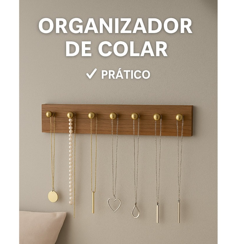 Organizador de Colares em MDF com Pinos Dourados – Minimalista, Elegante e Funcional Dê um toque de sofisticação e organização ao seu closet ou guarda-roupas com este organizador de colares moderno em MDF amadeirado, perfeito para quem valoriza estilo e praticidade. Com acabamento minimalista e pinos metálicos dourados, ele mantém seus colares sempre à vista, evitando nós e desgastes nas peças. Ideal para compor um ambiente elegante, o painel é fácil de instalar e combina perfeitamente com closets planejados e móveis de madeira. São 7 pinos que acomodam com segurança colares, correntes, pulseiras e até pulseiras finas. ✨ Destaques do Produto: Estilo moderno e sofisticado MDF amadeirado de alta qualidade Pinos metálicos na cor dourada Organização prática e visual Evita o emaranhado das peças Ideal para closets, guarda-roupas ou quartos Acompanha uma unidade na medida de 30cm x 6cm 7 Pinos dourado ou 9 Pinos dourado Transforme seu cantinho de acessórios com funcionalidade e bom gosto. 🛍️ Perfeito para quem ama joias bem organizadas!