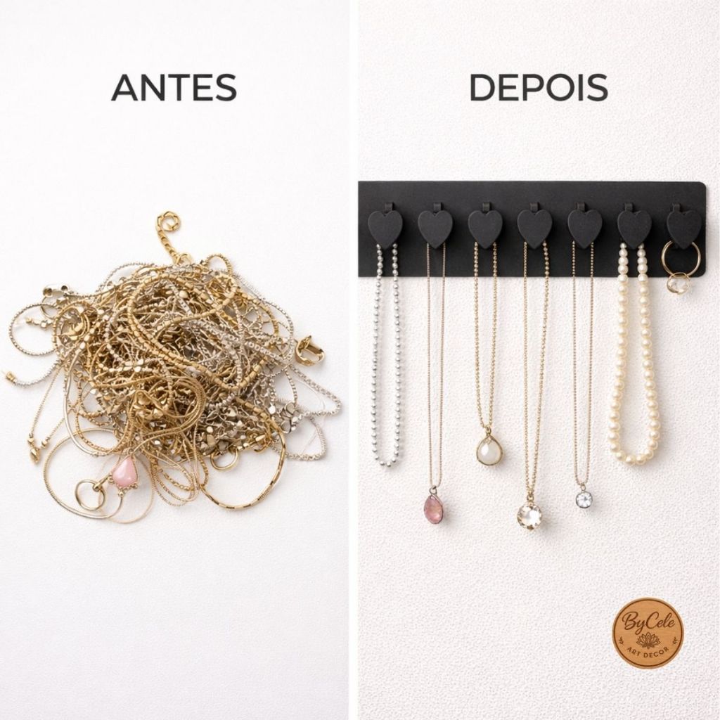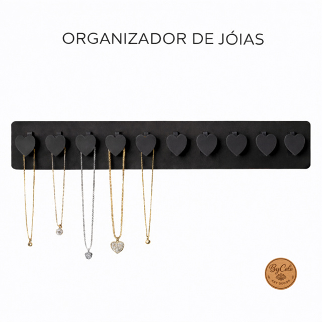 Mantenha seus acessórios organizados e sempre à mão com este organizador de joias para parede em formato de coração. Projetado para pendurar colares, pulseiras e anéis de forma prática, o suporte ajuda a evitar que as peças fiquem emboladas ou se percam em gavetas, deixando tudo visível e fácil de escolher no dia a dia. Seu design simples e funcional também contribui para a organização do ambiente, podendo ser utilizado em quartos, closets, penteadeiras ou espaços dedicados a acessórios. Fabricado em MDF de 3mm com corte a laser, o produto possui acabamento preciso e estrutura leve, ideal para uso diário. A instalação é rápida e sem complicação. O organizador acompanha fita dupla face que permite fixação direta na parede, dispensando furos e ferramentas. Especificações Material: MDF 3mm cortado a laser Largura: 20 cm Altura: 5 cm Instalação: fita dupla face (sem furos) Conteúdo da embalagem 1 Organizador de joias para parede 1 Fita dupla face para instalação