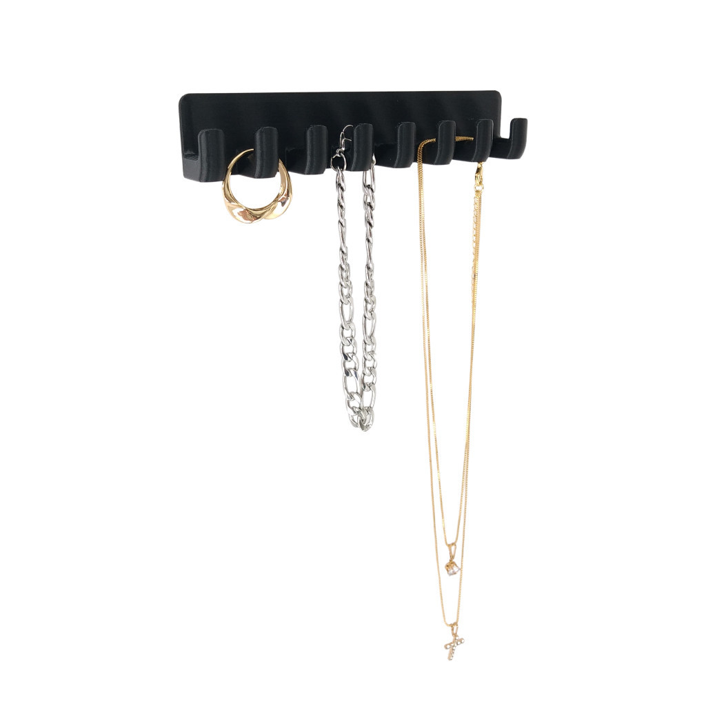 Organizador de joias e bijuterias modular. Organize todas as suas jóias com elegância e de forma rápida com nosso suporte adesivo para colares e jóias. Serve para diversos tipos de jóias e bijuterias, como colares, correntes, correntinhas, pulseiras, aneis e outros acessórios penduráveis. Minimalismo, durabilidade e estilo para combinar em qualquer lugar. Expositor compacto e modular para caber em qualquer lugar e na quantidade que precisar. Serve para armário, parede, banheiro, penteadeira, cabeceira, portas e onde você puder colar, graças à dupla-face de qualidade que já vai instalada. É só retirar a película e colar! Feito em plástico resistente com ganchos reforçados. Detalhes do Produto: Dimensões: 13,5 cm (Comprimento) x 2,6 cm (Altura) x 1,8 cm (Profundidade) Possui 8 ganchos Peso suportado: 0,5 Kg / 500 g Material: Plástico resistente. Cores: Preto, branco, cobre Obs: Antes de aplicar certifique que o local tenha superfície lisa e esteja bem limpo e seco. Recomendamos que aguarde 12h antes de pendurar peso.