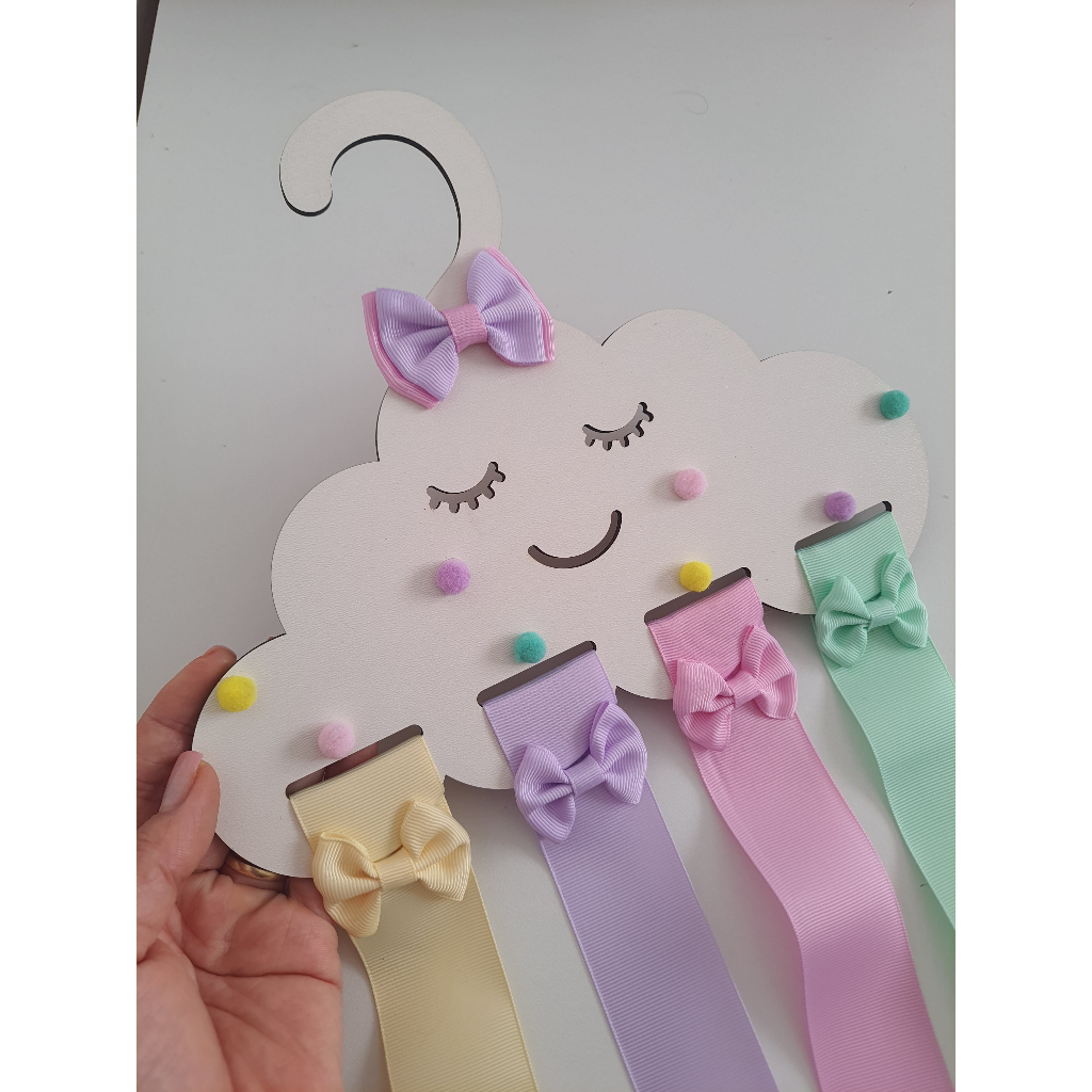 Organizador de laço infantil porta laços nuvem MDf colorido, cabide menina decorado pompom.