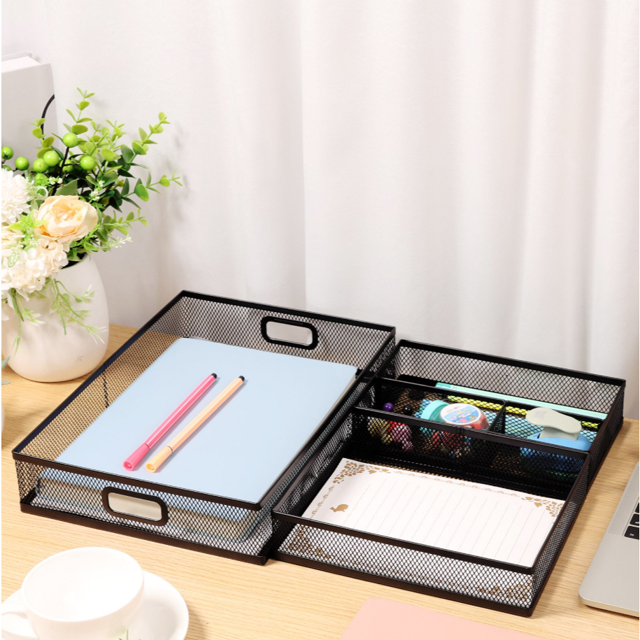 Deixe sua mesa mais organizada, funcional e com visual profissional com o Organizador de Mesa com Bandejas em Ferro. Ideal para escritórios, home office, estudos e ambientes corporativos, ele oferece uma solução prática para manter materiais sempre em ordem. Fabricado em ferro resistente com acabamento em pintura preta, possui estrutura em tela metálica que garante durabilidade, estabilidade e fácil visualização dos itens armazenados, além de um design moderno que combina com qualquer ambiente. Conta com bandejas amplas e compartimentos organizadores, perfeitos para armazenar documentos, papéis A4, cadernos, blocos de anotações, canetas, lápis, marcadores e pequenos acessórios, otimizando o espaço da mesa e facilitando o acesso aos materiais. Principais Benefícios Organização completa para mesa de escritório Estrutura em ferro resistente e durável Design moderno e profissional em tela metálica Bandejas e compartimentos para diversos itens Ideal para home office, empresas, escolas e escritórios Especificações Técnicas Material: Ferro Cor: Preto Tipo: Organizador de mesa com bandejas Dimensões aproximadas: 32,5 x 23,5 x 21 cm Conteúdo da Embalagem 1 Organizador de Mesa com Bandejas
