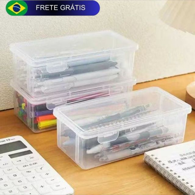 Organizador de mesa escritório para lápis caneta papelaria plástico multiuso com tampa e trava