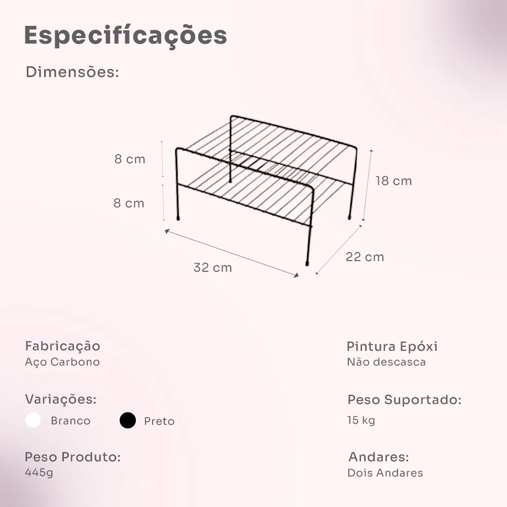 Organize sua cozinha de forma rápida e elegante! Nosso Organizador em Aço Carbono Reforçado é a solução ideal para ganhar espaço, deixar tudo visível e transformar seu armário sem reforma. Feito em aço carbono de alta resistência, com pintura eletrostática premium, ele não enferruja, não descasca e suporta bastante peso. ✔ Mais de 60 avaliações reais comprovando a qualidade! ⸻ Modelos e Dimensões Cor: Branco e Preto Modelos disponíveis: • Média: 32x22x14 cm – suporta até 6 kg • Dupla: 32x22x18 cm – suporta até 15 kg • Cantoneira: 22x22x18 cm – suporta até 8 kg • Quadrado: 26x26x22 cm – suporta até 15 kg (Variação de 1–3 cm) Opções: Unidade, Kit com 2, 3 e 4 (melhor custo-benefício). Por que comprar? ✓ Aço carbono reforçado ✓ Antiferrugem e antiderrapante ✓ Suporta muito peso ✓ Design moderno ✓ Aumenta o espaço do armário de forma imediata ✓ Kits perfeitos para organizar a cozinha inteira Garantia e envio * Embalagem reforçada * Envio rápido * Suporte pós-compra * Troca garantida em caso de defeito ⸻uma casa mais organizada e bonita!