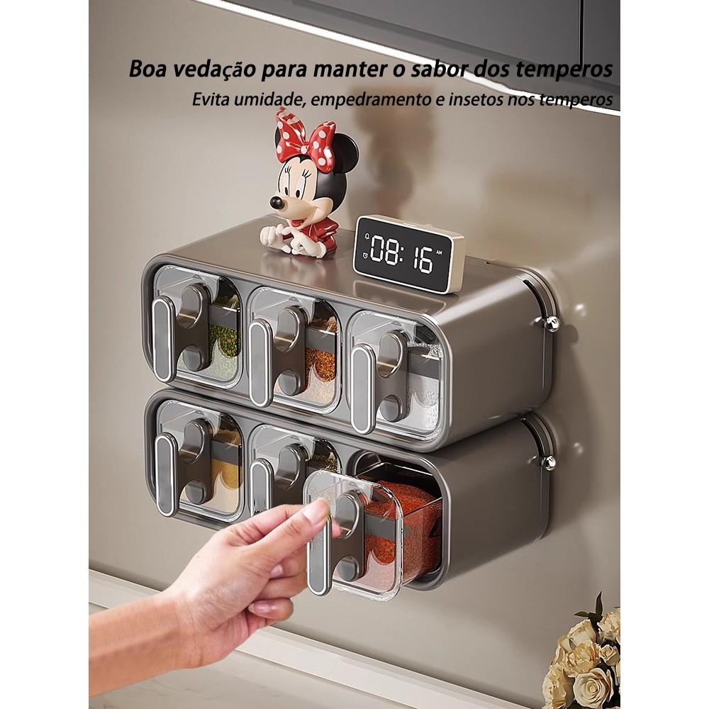 Design Economiza Espaço: Uso duplo horizontal e vertical: Conjunto de armazenamento montado na parede com vedação, pode ser colocado livremente na horizontal ou vertical, uso sem restrições, dupla funcionalidade sem ocupar espaço, organizado e arrumado. Classificação e combinação personalizável: Espaço de armazenamento duplicado na parte superior, costurado firmemente e evita mistura de sabores. Estrutura Durável: Caixa de temperos com alça e colher: Prateleira de especiarias montada na parede com adesivo, recipientes de condimentos empilháveis, feitos de materiais PP e PET de alta qualidade, saudáveis e seguros, duráveis e práticos. Design cuidadoso: Equipado com uma colher pequena de fácil acesso, controle preciso adequado para vários temperos, mantendo a cozinha limpa. Design e Limpeza: Caixa de temperos montada na parede: Conjunto expansível de 2 níveis, projetado para conveniência, como design estilo gaveta e vedação para evitar umidade e empedramento dos temperos, com anel de vedação integrado para proteção total da saúde. Fácil de desmontar e lavar: Limpeza conveniente. Armazenamento Classificado: Ideal para vários temperos: Pode classificar e armazenar diferentes temperos, como sal, açúcar, pimenta, vários molhos, etc. Isso não apenas organiza os temperos de forma ordenada, mas também possui design de caixa transparente para visibilidade clara, economizando espaço na bancada e facilitando o acesso aos temperos durante o cozimento. Fácil de Instalar: Prateleira de especiarias sem perfuração: Organizador de armazenamento para porta de armário, instalação sem pregos não requer ferramentas complexas ou habilidades profissionais, tornando a instalação fácil. Além disso, se for necessário limpar ou reorganizar a cozinha, também pode ser facilmente desmontado.