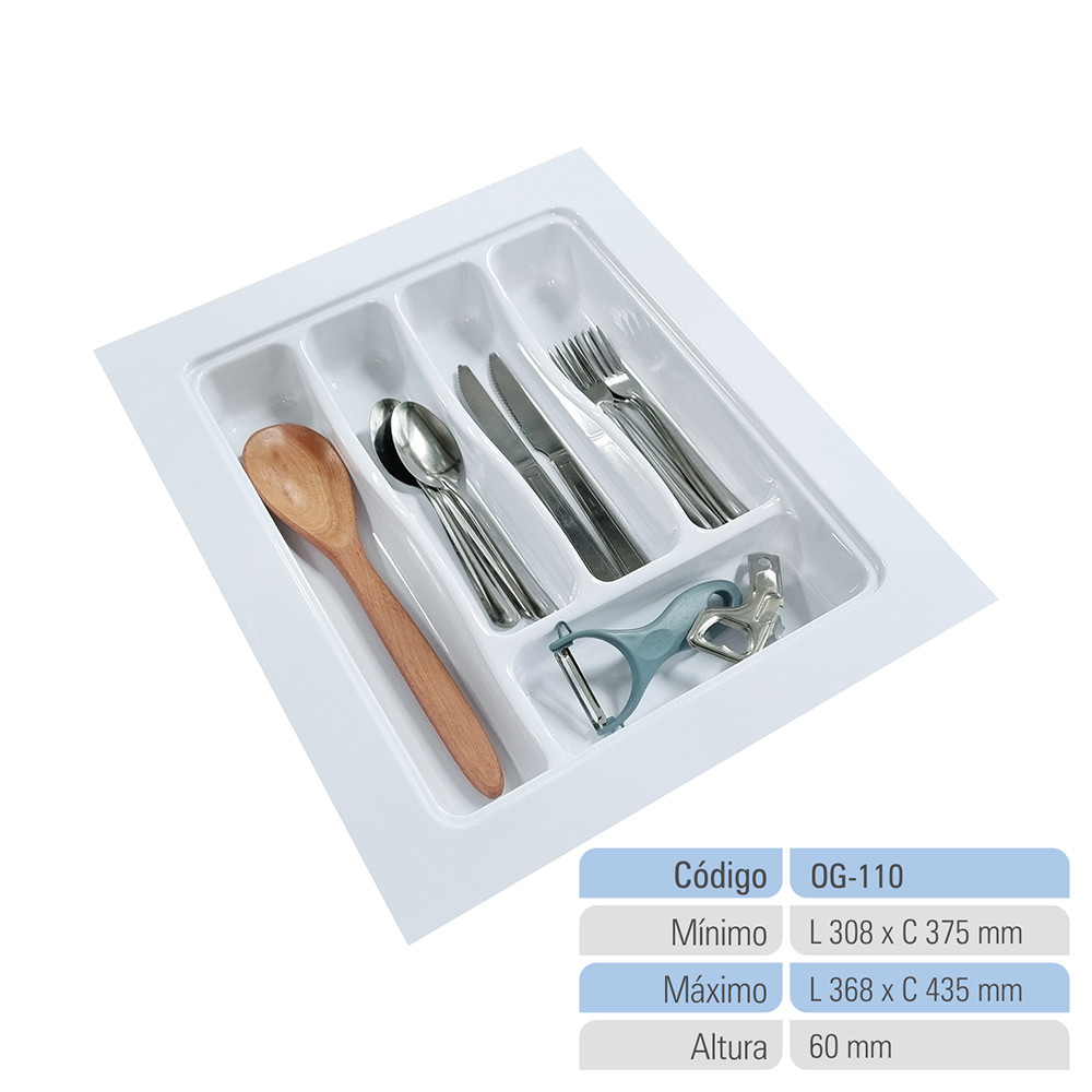 - Organizador de Gaveta Ajustável OG-110 Mais praticidade e organização no seu dia a dia - Mantenha sua gaveta sempre organizada com o Organizador OG-110. Ideal para separar talheres e pequenos utensílios, ele facilita o acesso no dia a dia e otimiza o espaço interno, deixando tudo visível e bem distribuído. - Fabricado em material resistente, é durável, prático e fácil de limpar, sendo perfeito para uso diário em diferentes ambientes da casa. Medidas compatíveis Mínimo: largura 308 mm x comprimento 375 mm Máximo: largura 368 mm x comprimento 435 mm Compatibilidade Indicado para gavetas dentro dessas medidas Se a largura estiver entre 308 e 368 mm e o comprimento entre 375 e 435 mm, o encaixe será adequado Importante Meça sempre a parte interna da gaveta antes da compra para garantir o encaixe correto Características do produto Divisórias práticas para melhor separação dos talheres Design compacto que se adapta à maioria das gavetas Material resistente e durável Fácil de limpar e manter higienizado Ideal para organizar talheres e pequenos utensílios Leve, funcional e fácil de reposicionar Modo de uso Meça o espaço interno da gaveta Ajuste o organizador conforme necessário Posicione dentro da gaveta Separe os itens por tipo nas divisórias Utilize diariamente para manter a organização Modo de limpeza Limpe com pano úmido e sabão neutro Pode ser lavado com água corrente Utilize esponja macia para evitar riscos Seque bem antes de guardar Evite produtos abrasivos Cuidados com o produto Evitar exposição à umidade excessiva Não utilizar com objetos muito quentes Manter seco quando não estiver em uso Perguntas frequentes O organizador serve para quais tipos de itens? - Pode organizar talheres, utensílios de cozinha, maquiagens, acessórios, roupas íntimas e materiais de escritório. Como escolher o tamanho ideal? - Meça o espaço interno da gaveta e verifique se está dentro das medidas compatíveis. O material é resistente? - Sim, é feito com material durável para uso diário. É fácil de limpar? - Sim, basta pano úmido ou lavagem com água e sabão neutro. O organizador escorrega na gaveta? - Depende da superfície, mas pode ser usado um forro para maior estabilidade.