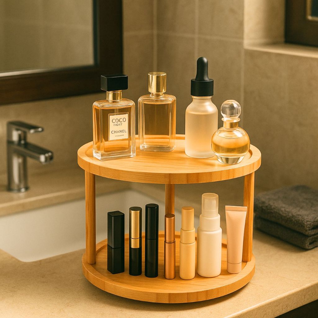 Organizador Giratorio 2 Andares Bambu Suporte Porta Tempero Cozinha Banheiro Armario Bancada Bandeja