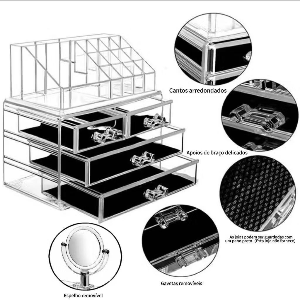 ENVIO IMEDIATO ✨ Organizador de Maquiagem Acrílico Transparente – Com ou Sem Espelho ✨ Mantenha sua penteadeira, banheiro ou bancada sempre organizada com este organizador de maquiagem em acrílico cristalino, moderno, funcional e elegante. Ideal para quem busca praticidade sem abrir mão do design. Fabricado em material transparente de alta qualidade, permite visualizar facilmente todos os seus itens, facilitando o dia a dia e otimizando o espaço. ⸻ 🧴 Principais Características: ✔ Design em grade com compartimentos de diferentes tamanhos ✔ Ideal para organizar maquiagens, cosméticos, pincéis, perfumes e acessórios ✔ Gavetas com puxadores delicados e acabamento refinado ✔ Cantos arredondados e bordas polidas, lisas e seguras ✔ Material acrílico resistente, cristalino e fácil de limpar ✔ Visual moderno que combina com qualquer ambiente ⸻ 🔹 Variações Disponíveis: ➡ Com Espelho: acompanha espelho giratório, ideal para maquiagem e cuidados diários ➡ Sem Espelho: versão compacta, perfeita para quem já possui espelho ou deseja mais espaço (Selecione a variação desejada antes de finalizar a compra) ⸻ 🎁 Ideal para: * Maquiagem * Cosméticos * Skincare * Acessórios pequenos * Uso pessoal ou presente