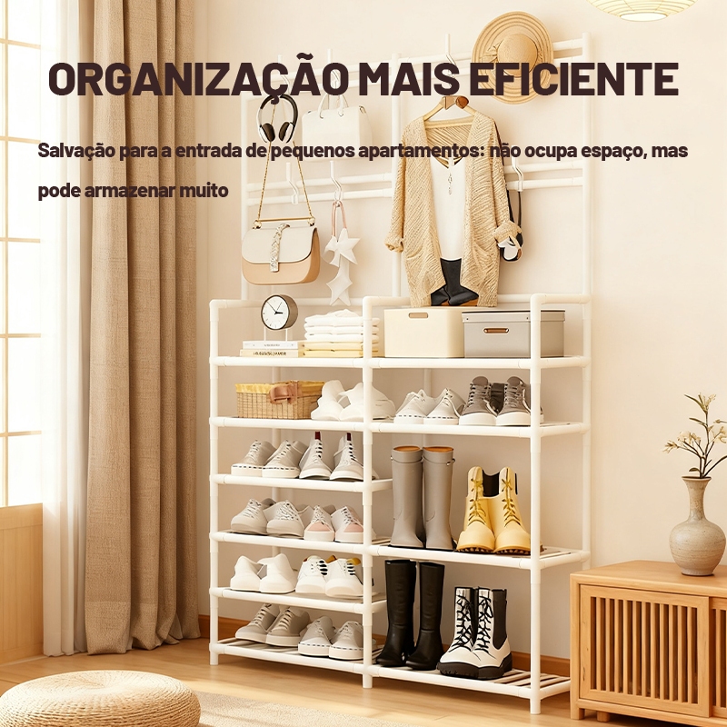 Organize seus sapatos e acessórios com estilo e praticidade com este organizador modular multifuncional! Este rack de sapatos possui prateleiras ajustáveis e ganchos superiores para pendurar bolsas, chapéus, e outros itens. Perfeito para otimizar o espaço no seu hall de entrada ou quarto, este suporte comporta de 10 a 16 pares de sapatos. Sua estrutura resistente e design compacto o tornam ideal para qualquer ambiente. Características do Produto: Estrutura robusta, ideal para sapatos e acessórios Ganchos para pendurar itens como chapéus, bolsas e casacos Suporta de 10 a 16 pares de sapatos, dependendo do modelo Prateleiras ajustáveis para maior flexibilidade Design moderno e minimalista, perfeito para diversos estilos de decoração Fácil de montar, sem necessidade de ferramentas complexas Material durável e resistente, fácil de limpar Benefícios: Versatilidade: Adequado para diferentes tipos de calçados, como tênis, botas, sapatilhas e sapatos de salto. Organização: Mantém seus sapatos, roupas e acessórios organizados e ao alcance das mãos. Economia de espaço: Ideal para ambientes pequenos, como entradas, quartos ou closets.