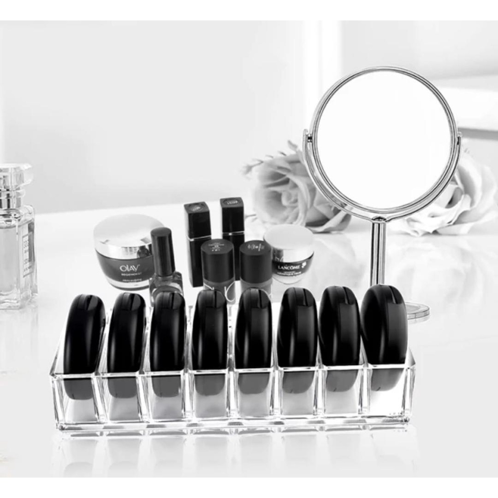 Descrição O organizador em Acrílico serve para organizar suas Paleta, Batons e Blush.. - Excelente Produto de alta Qualidade; - Excelente Para Presentear; • Dimensões : -comprimento -21 cm; -Altura -04 cm; -Largura -09 cm; -Profundidade d Produto -04 cm. -ESPAÇO D UMA DIVISORIA PARA OUTRA É 2,75 CM.. - Qualquer duvidas estamos disposição.