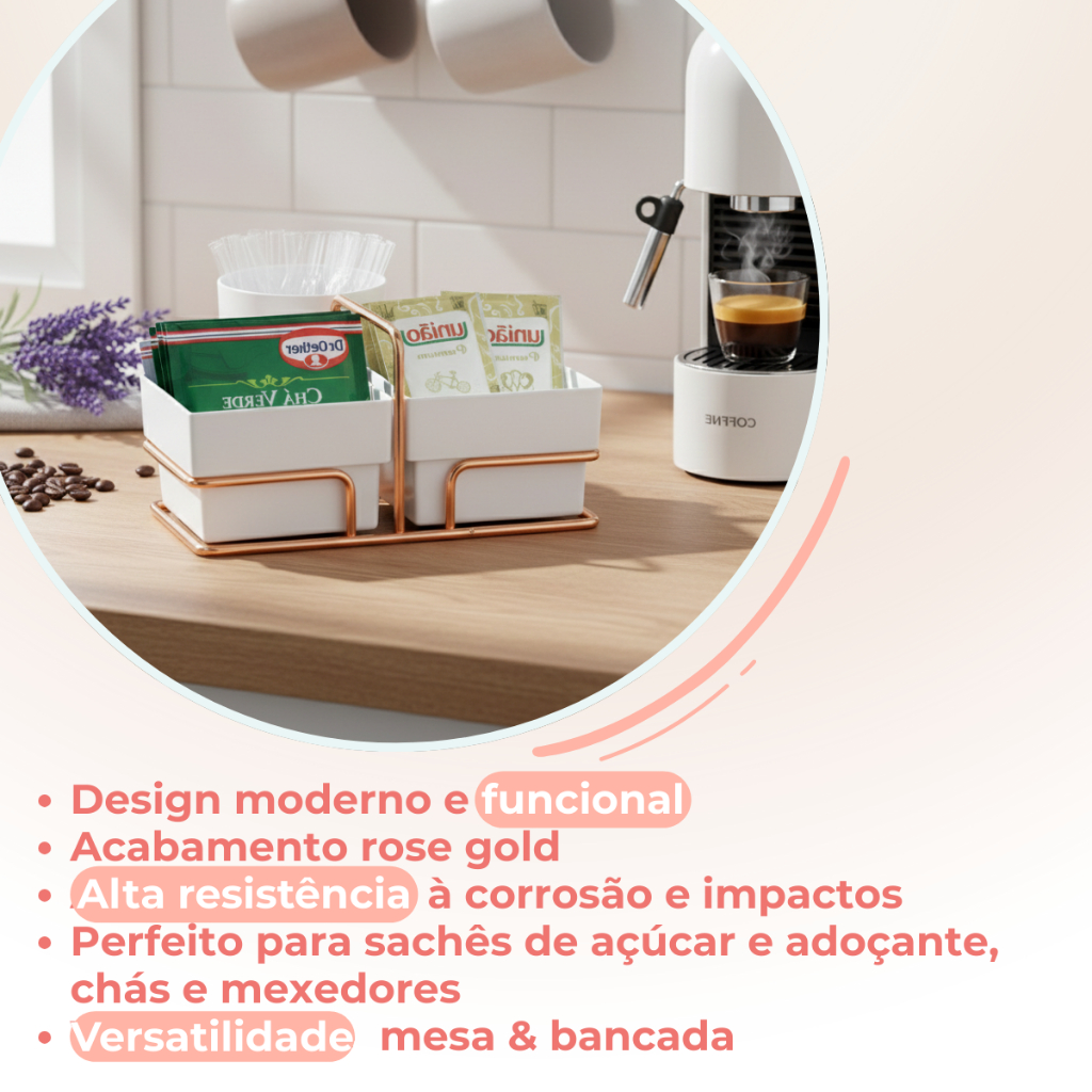 Organizador Para Saches De Açúcar Adoçante Mexedor Chá Café De Bancada Rose Gold