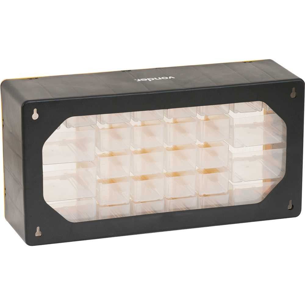 O organizador plástico OPV 300 VONDER é ideal para armazenar e organizar itens pequenos, como parafusos, porcas, pregos, componentes eletrônicos, materiais de pesca e até medicamentos. Versátil, pode ser utilizado tanto apoiado em superfícies quanto pendurado na parede, adaptando-se a oficinas, residências e ambientes de trabalho. Conta com 30 gavetas em dois tamanhos diferentes, facilitando a separação e visualização dos itens. Sua estrutura em polipropileno é leve e resistente, com design funcional em preto/amarelo e bandejas transparentes, que ajudam a identificar rapidamente o conteúdo de cada compartimento. Características: Referência: 6108300000 Modelo: OPV 300 Material: Polipropileno Cor: Preto/amarelo com bandejas transparentes Capacidade de carga: Apoiado – 20 kgf / Pendurado – 10 kgf Comprimento: 500 mm Largura: 160 mm Altura: 250 mm Massa aproximada: 2,18 kg Gavetas menores: 133 mm x 50 mm x 37 mm Gavetas maiores (laterais): 133 mm x 112 mm x 53 mm Benefícios: Ideal para organizar uma grande variedade de itens pequenos 30 compartimentos que otimizam o espaço e facilitam a separação Pode ser utilizado apoiado ou fixado na parede Bandejas transparentes facilitam a visualização do conteúdo Estrutura resistente com excelente aproveitamento de espaço Conteúdo da embalagem: 1 Organizador plástico