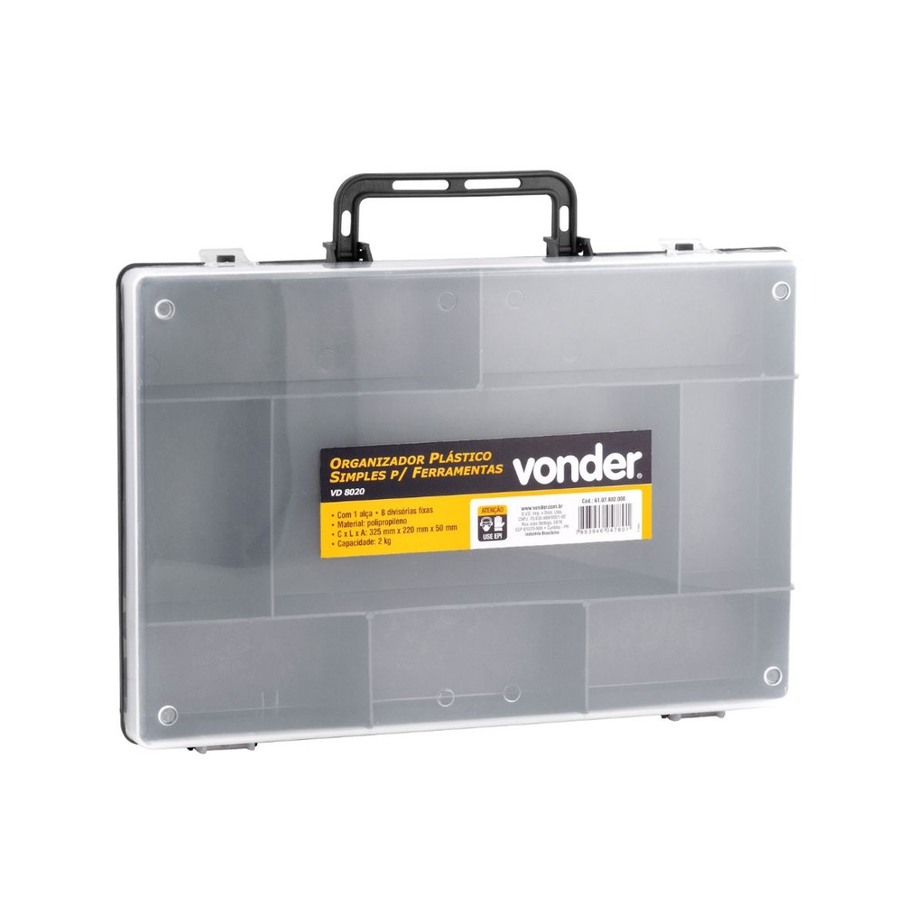 Indicado para organizar e armazenar ferramentas, peças e acessórios em geral. Possui 1 alça e 8 divisórias fixas. Conteúdo da Embalagem: 1 Organizador plástico. Detalhes técnicos: Modelo: VD 8020 Material: Polipropileno Comprimento: 325 mm Largura: 220 mm Altura: 50 mm Capacidade de carga (kgf): 2 kgf Cor do organizador para ferramentas: Preto e transparente Massa aproximada (peso): 0,4 kg
