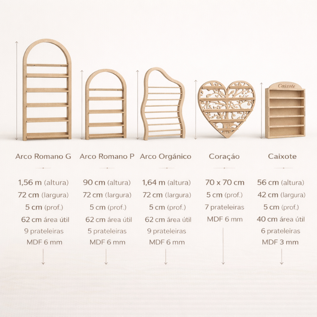O Porta Esmalte de Parede em MDF foi desenvolvido para organizar e expor esmaltes de forma prática, elegante e funcional. Ideal para salões de beleza, estúdios de manicure e também para quem deseja criar um cantinho de autocuidado em casa, ele mantém os esmaltes sempre visíveis, organizados e de fácil acesso. Fabricado em MDF, o suporte oferece uma estrutura leve, resistente e com acabamento que valoriza a decoração do ambiente. As prateleiras permitem acomodar diversos esmaltes de maneira organizada, facilitando a escolha de cores durante o atendimento ou no uso diário. O design com arco decorativo cria um visual moderno e diferenciado na parede, além de abrir possibilidades criativas de personalização com iluminação LED, flores artificiais, adesivos decorativos ou outros elementos que combinem com o estilo do espaço. Além de funcional, o organizador de esmaltes em MDF também contribui para uma apresentação mais profissional do ambiente, tornando a exposição dos esmaltes mais organizada, prática e visualmente atraente. Disponível em diferentes modelos e tamanhos para atender diferentes necessidades de organização e espaço. BENEFÍCIOS • Organização prática dos esmaltes, mantendo todos visíveis e acessíveis • Ideal para salões de beleza, manicures e espaços de autocuidado • Estrutura em MDF que oferece boa durabilidade e estabilidade • Design decorativo que valoriza a parede e o ambiente profissional • Prateleiras que facilitam a separação e visualização das cores • Possibilidade de personalização com LEDs, flores ou adesivos • Estrutura desmontável que facilita transporte e montagem • Instalação firme na parede com parafusos e buchas MEDIDAS SUPORTE COM ARCO ROMANO G Altura: 1,56 m Largura: 72 cm Profundidade: 5 cm Largura interna (área útil): 62 cm Prateleiras: 9 unidades Cada prateleira: 60 cm x 5 cm Espessura do MDF: 6 mm SUPORTE COM ARCO ROMANO P Altura: 90 cm Largura: 72 cm Profundidade: 5 cm Largura interna (área útil): 62 cm Prateleiras: 5 unidades Cada prateleira: 60 cm x 5 cm Espessura do MDF: 6 mm SUPORTE COM ARCO ORGÂNICO Altura: 1,64 m Largura: 72 cm Profundidade: 5 cm Largura interna (área útil): 62 cm Prateleiras: 9 unidades Cada prateleira: 60 cm x 5 cm Espessura do MDF: 6 mm SUPORTE CORAÇÃO Altura: 70 cm Largura: 70 cm Profundidade: 5 cm Prateleiras: 7 unidades Espessura do MDF: 6 mm SUPORTE CAIXOTE Altura: 56 cm Largura: 42 cm Largura interna (área útil): 40 cm Profundidade: 5 cm Prateleiras: 6 unidades Cada prateleira: 40 cm x 5 cm Espessura do MDF: 3 mm INFORMAÇÕES IMPORTANTES • Material: MDF • Cor: MDF cru (ideal para pintura ou personalização) • Produto enviado desmontado • Acompanha parafusos e buchas para fixação das prateleiras • Necessita montagem simples • Pode ser personalizado com pintura, iluminação LED ou elementos decorativos conforme preferência.