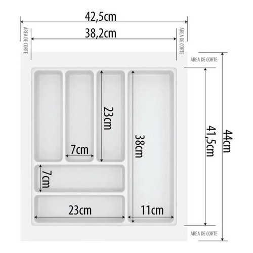 Organizador Porta Talheres Separador Gaveta Branco Lj-0803 Feito em Polipropileno de Alta Resistência, é prático, durável e fácil de limpar. O diferencial deste modelo é ser Ajustável: as bordas podem ser cortadas manualmente para um encaixe perfeito e sob medida na sua gaveta, preenchendo todos os espaços. Vantagens e benefícios Ajuste perfeito com corte: As bordas podem ser cortadas manualmente para um encaixe preciso, adaptando-se a larguras de 38,2cm até 42,5cm e profundidades de 41,5cm até 44cm. Material robusto: Fabricado em Polipropileno de alta resistência, é um plástico durável que não dobra com o peso dos utensílios e tem longa vida útil. Organização ideal: Possui múltiplas divisórias fixas para armazenar e organizar todos os seus talheres, facas e utensílios maiores, mantendo a gaveta limpa. Design prático: Com 5cm de altura, cabe na maioria das gavetas padrão e seu material liso facilita a higienização. Encaixe preciso: O design permite preencher perfeitamente os espaços da gaveta, dando um acabamento profissional e organizado. Especificações técnicas Marca: Cango Referência: LJ-0803 Material: Polipropileno Alta Resistência Cor: Branco Medida Máxima SEM CORTE (LxPxA): 42,5 cm x 44 cm x 5 cm Medida Mínima COM CORTE (LxPxA): 38,2 cm x 41,5 cm x 5 cm O que acompanha 1 Divisor Porta Talheres Ajustável LJ-0803 Informações importantes Atenção: Pedimos que tire as medidas de sua gaveta antes de realizar a compra para garantir que o produto seja compatível. O corte das bordas deve ser feito manualmente pelo cliente; o material é resistente.