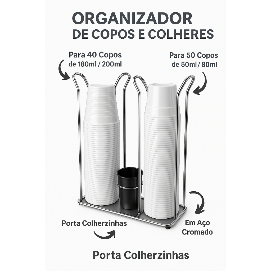 Suporte para Copos Descartáveis – 200ml e 80ml | Modelos Cromado e Preto Mantenha sua cozinha, copa ou área de café organizada com muito mais praticidade e elegância! O Suporte para Copos Descartáveis é ideal para quem busca funcionalidade aliada a um design moderno. Fabricado em aço cromado de alta qualidade, ele oferece resistência, durabilidade e sofisticação ao ambiente. Modelo Duplo – 200ml e 80ml | CROMADO Detalhes do Produto: Compatível com copos de 200ml e 80ml Estrutura em aço cromado resistente Acompanha potinho preto organizador Ideal para uso em cozinhas, escritórios, comércios e consultórios Ficha Técnica: Dimensões: 27 cm (A) x 20,5 cm (L) x 7 cm (P) Material: Aço Cromado + Plástico Polipropileno Cor: Cromado com potinho preto Suporte para Copos Descartáveis – 200ml | Modelo Simples Para quem precisa de uma solução prática e compacta, o modelo individual para copos de 200ml é a escolha ideal. Fabricado em aço cromado, combina durabilidade e visual sofisticado. Ficha Técnica: Dimensões: 27,5 cm (A) x 8 cm (L) x 8 cm (P) Material: Aço Cromado Cor: Cromado Capacidade: Copos de 200ml Destaques: ✔ Organização prática e eficiente ✔ Design moderno que combina com qualquer ambiente ✔ Alta durabilidade com acabamento premium ✔ Ideal para ambientes residenciais ou comerciais