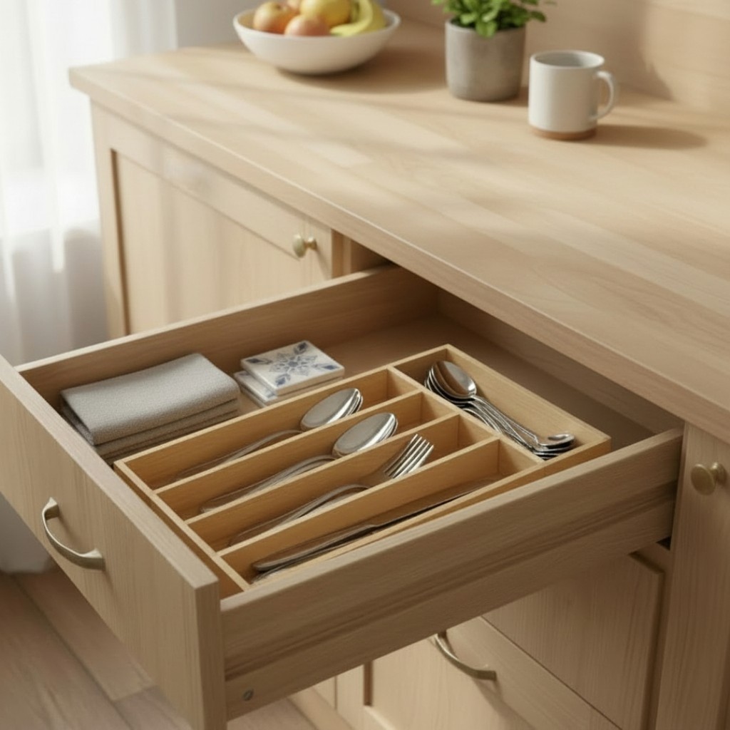 Organizador de Talheres em Bambu Natural Mantenha sua cozinha mais organizada e funcional com este organizador de talheres em bambu. Ideal para gavetas, ele possui divisórias práticas que facilitam a separação de colheres, garfos, facas e utensílios menores. Seu acabamento natural combina com diversos estilos de cozinha. - 5 compartimentos internos - Ideal para organização de talheres e utensílios - Design compacto e funcional - Fácil de limpar -Estrutura firme e durável * Material: Bambu * * Comprimento: 33 cm * * Largura: 23 cm * * Altura: 4,5 cm * OBSERVAÇÕES: Verifique as medidas da sua gaveta antes da compra. Produto não acompanha talheres ou utensílios. Limpar com pano úmido. Não deixar submerso em água. Com divisórias bem distribuídas, permite separar talheres de forma prática. O tamanho é ideal para gavetas padrão de cozinha. Também pode ser usado para organizar utensílios, acessórios ou pequenos objetos. Organize sua cozinha com mais praticidade e aproveite um ambiente mais funcional no dia a dia.