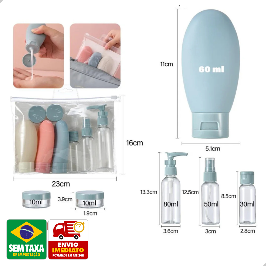 Organize-se em qualquer viagem com o conjunto portátil de frascos e potes para cosméticos e higiene. Compacto e leve, ele permite transportar líquidos e cremes em quantidades ideais, evitando excesso de volume na mala e atendendo às exigências de bagagem de mão. Os frascos são fabricados em material resistente, livres de BPA e com design pensado para facilitar a reposição e limpeza. Com aberturas largas e etiquetas de identificação, você garante praticidade e higiene no uso diário. Além disso, são laváveis e reutilizáveis, tornando o kit uma escolha sustentável. Disponível em diferentes combinações de peças, o kit é perfeito para viajantes frequentes, amantes de skincare ou até para quem gosta de manter tudo bem organizado no dia a dia. Um item indispensável para quem busca praticidade e estilo em movimento.