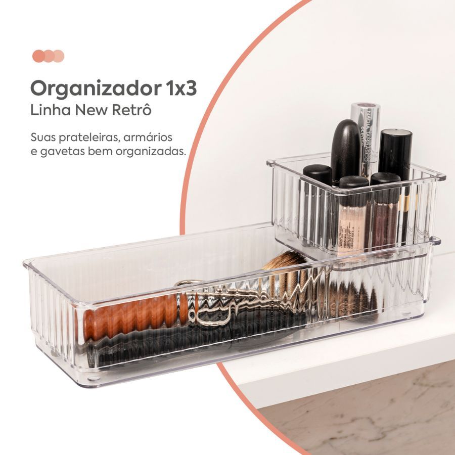 Organizadores Linha New Retrô em Cristal – Organização Modular com Estilo Retrô! Dê um toque de sofisticação à sua organização. Com visual canelado, design modular e empilhável, ele combina charme retrô com praticidade moderna. Ideal para gavetas e pequenos espaços, é perfeito para manter tudo em ordem de forma elegante e funcional. Destaques que fazem a diferença: Design modular e empilhável: Permite criar composições personalizadas, otimizando o espaço conforme a sua necessidade. Visual canelado com acabamento retrô: Une sofisticação e estilo atemporal à praticidade do dia a dia. Ideal para organização de gavetas: Aproveita cada centímetro disponível com eficiência e mantém os itens visíveis e bem separados. Alta durabilidade: Fabricado em PET, material ultra-resistente que remete ao vidro, mas com a leveza e resistência do plástico. Versatilidade de uso: Pode ser utilizado em diferentes ambientes como banheiro, quarto, cozinha, escritório ou lavanderia. Características técnicas: Material: PET (Polietileno Tereftalato) – 100% reciclável Tamanhos: (CxLxA) 230 ml: 8 x 8 x 5 cm 500 ml: 16 x 8 x 5 cm 700ml: 24 x 8 x 5 cm 1L 1x4: 32 x 8 x 5 cm 1L 2x2: 16 x 16 x 5 cm 1,6L 2x3: 24 x 16 x 5 cm 2,1 L 2x4: 32 x 16 x 5 cm 2,7 L 2x5: 40 x 16 x 5 cm Cor: Cristal (transparente) Indicações de uso: Ideal para gavetas, prateleiras e superfícies planas Pode ser usado: No freezer e na geladeira Cuidados: Não utilizar em micro-ondas ou lava-louças. Para limpeza, usar água e sabão neutro com o lado macio da esponja. Organize com personalidade e funcionalidade! Escolha os Organizadores da Linha New Retrô em Cristal e leve o charme do retrô repaginado para todos os cantos da sua casa!