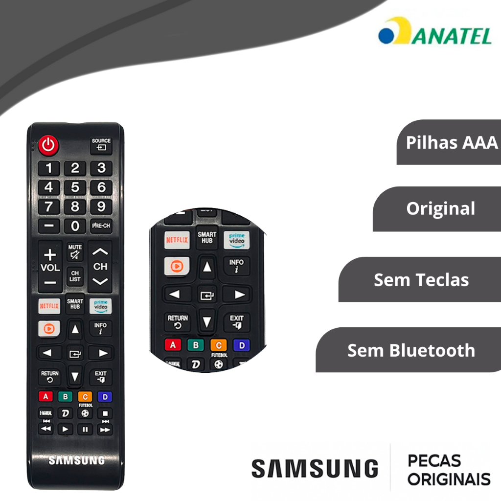 🎯 Controle Remoto Original Samsung Smart TV – Universal (BN59-01315HA) Perdeu ou danificou o controle da sua TV? Esse é o controle original Samsung, modelo Universal, compatível com diversas Smart TVs recentes. Pronto para uso, basta inserir as pilhas e aproveitar novamente toda a experiência da sua TV sem complicação. ✅ Por que escolher o original Produto 100% original Samsung, novo e lacrado Botões de atalho para Netflix, Prime Video e Globo Play Conexão imediata e navegação fluida Enviado com nota fiscal + garantia de 90 dias Durabilidade, conforto e resposta precisa nos comandos 📲 Compatibilidade confirmada Compatível com modelos das séries T e BET (a partir de 2020), incluindo: Modelos : UN32T4300, UN40T4300, UN32T5300, UN40T5300, UN43T5300 LH32BETBLG, LH43BETMLG, LH32BETBLGGXZD, LH43BETMLGGXZD UN32T4300AGXZD, UN40T5300AGXZD, UN43T5300AGXZD ⚠️ Importante: Não funciona em TVs Samsung fabricadas antes de 2020, como: ES5000, F5500, H5300, J4300, J5290, JU6500, K5300, KU6000, MU6100, NU7100. Se sua TV é de linha T ou mais recente, ele vai funcionar perfeitamente. ⚙️ Especificações Marca: Samsung Modelo: BN59-01315HA Cor: Preto Botões de atalho: Netflix / Prime Video / Globo Play Comando de voz: Não Pilhas: Não incluídas 🔒 Originalidade garantida Produto novo Lacrado Original Samsung Enviado com nota fiscal e garantia de fábrica. 🚀 Aproveite agora 📦 Pronta entrega e envio imediato para todo o Brasil. ⚠️ Estoque limitado — garanta o seu antes que acabe