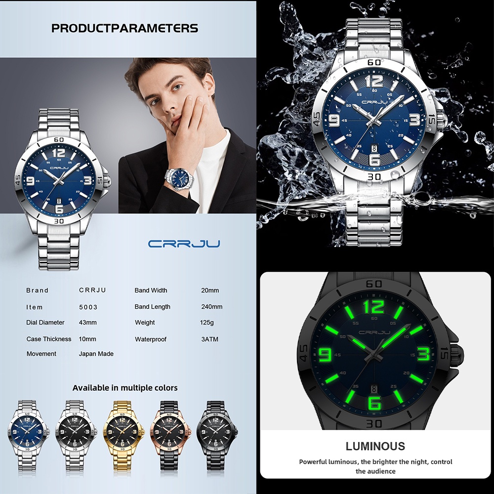 Bem-vindo à nossa loja ✅⌚Entrega: Todos os pedidos serão enviados dentro de 24h. ✅⌚Pós-venda: Melhor solução para seus problemas. ✅⌚Espero que aproveite suas compras. —————————————————————— 💎⌚Característica: ★⌚Luminoso -★⌚À prova d'água 3ATM / 30M★⌚(Não Opere os botões do relógio na água e não use o relógio em contato com água quente). -★⌚Alta qualidade★:⌚ 100% novo vidro mineral de alta dureza (anti-risco), estojo de alta qualidade durável. -★⌚Ideias de presente: relógios são ótimos presentes, aniversários, aniversários de amigo, amados, dia das mães, presentes de formatura, presentes de dia dos namorados, ou como presentes para trabalho e festas。 💎⌚Especificações: Tamanho do Mostrador(Diâmetro):43mm Espessura do Mostrador: 10mm - Espessura do Mostrador: 10mm - Tamanho da alça (comprimento): 24 cm - Tamanho da alça (Largura): 20mm 💎⌚Descrição: Marca: CRRJU Número do modelo: 5003 XS Material da caixa: liga -Material Da cinta: Aço inoxidável Gênero da moda: Homens Estilo: Esporte, Casual, Negócios, Moda Exibição: Analógico 💎⌚Os produtos incluem produtos Relógios genuínos -100% de relógios genuínos [sem Caixa] 💎⌚Tempo de garantia:Não A Loja faz o melhor para resolver o problema para você】 —————————————————————— -★⌚Serviço: 1.Somos o fabricante original. 2.Todos os produtos são 100% novos e originais. 3.Estamos empenhados em oferecer-lhe produtos com a mais alta qualidade com preço razoável. 4.Loja dedicada a oferecer uma boa experiência ao cliente! 5.A satisfação do cliente é a busca vital para nós como sempre.