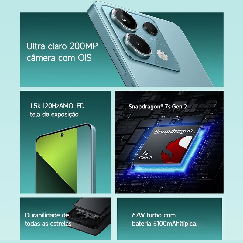 Nossos celulares são todos originais e contam com 1 ano de garantia oficial da Xiaomi. Redmi Note 13 Pro Global ROM Nota: A versão CN instalou Global ROM, Não suporta atualização OTA. Não é versão internacional, por favor, verifique bem antes de comprar. CPU--------------- CPU Qualcomm Snapdragon 7S Gen 2 Octa Core, até 2,4 GHz, GPU Adreno 710 Tela------------ Tela de 6,67 polegadas 2712 x 1220 1,5K, taxa de atualização de 120 Hz, taxa de amostragem de toque de até 2160 Hz RAM + ROM------- 8+256 GB Câmera----------- Câmera traseira OIS tripla 200MP + 8MP + 2MP, câmera frontal de 16MP Bateria------------ 5100mAh (Typ), suporte para carregamento rápido de 67W, carregador em caixa de 67W SO----------------- Xiaomi HyperOS Sensor-------------- Sensor de distância ultrassônico| Sensor de luz ambiente| Sensor de aceleração| Bússola eletrônica| Giroscópio| Controle remoto infravermelho| Linear do eixo X <Motor Outros--------------- Wi-Fi, GPS, sensor de impressão digital, desbloqueio facial AI, entrada para fone de ouvido de 3,5 mm, alto-falantes duplos estéreo, certificação de áudio de alta resolução, Dolby Atmos, SEM NFC Posicionamento de navegação --- Beidou: B1I + B1C| GPS: L1| Galileo: E1 |GLONASS:G1|QZSS:L1| A-GNSS: A-GPS/A-GLONASS Posicionamento de rede| Posicionamento assistido por sensor Conteúdo do pacote - Redmi Note 13 Pro / Adaptador / Cabo USB tipo C / Ferramenta de ejeção SIM / Capa protetora / Guia de início rápido / Cartão de garantia Rede------------- SIM Dupla 5G| Netcom completo 7.0 5G: n1/n3/n5/n8/n28a (suporte: 703MHz-733MHz, baixo: 758MHz-788MHz)/n38/n41/n77/n78 4G: FDD-LTE:B1 / B3 / B5 / B8 / B19 TDD-LTE:B34 / B38 / B39 / B40 / B41 *Nota: LTE B41 (2496-2690 194MHz); 3G: WCDMA:B1 / B5 / B6 / B8 / B19 2G: GSM:B3 / B5 / B8; CDMA 1X:BC0 Conexão de dados: Protocolos WLAN: Wi-Fi 5, Wi-Fi 4 e 802.11a/b/g Frequência WLAN: 2.4G WiFi| Wi-Fi 5G Suporte 2x2 MIMO, WiFi direto Bluetooth 5.2 Suporta SBC/AAC/LDAC
