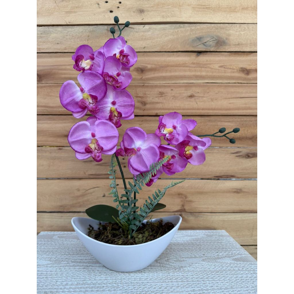 Arranjo de orquideas em seda efeito real alta qualidade, possui cores vivas . Vaso em melamina canoa. Produto decorativo, ideal para complementar decorações modernas e sofisticadas com um toque de natureza. ****Enviamos em embalagem apropriada e bem protegido**** DESCRIÇÃO DO PRODUTO: Altura total do arranjo 30cm. Comprimento do vaso 20cm, Material do vaso: melanina. O Arranjo é enviado montado em embalagem com proteção resistente, tudo chegará em perfeito estado assim como na imagem