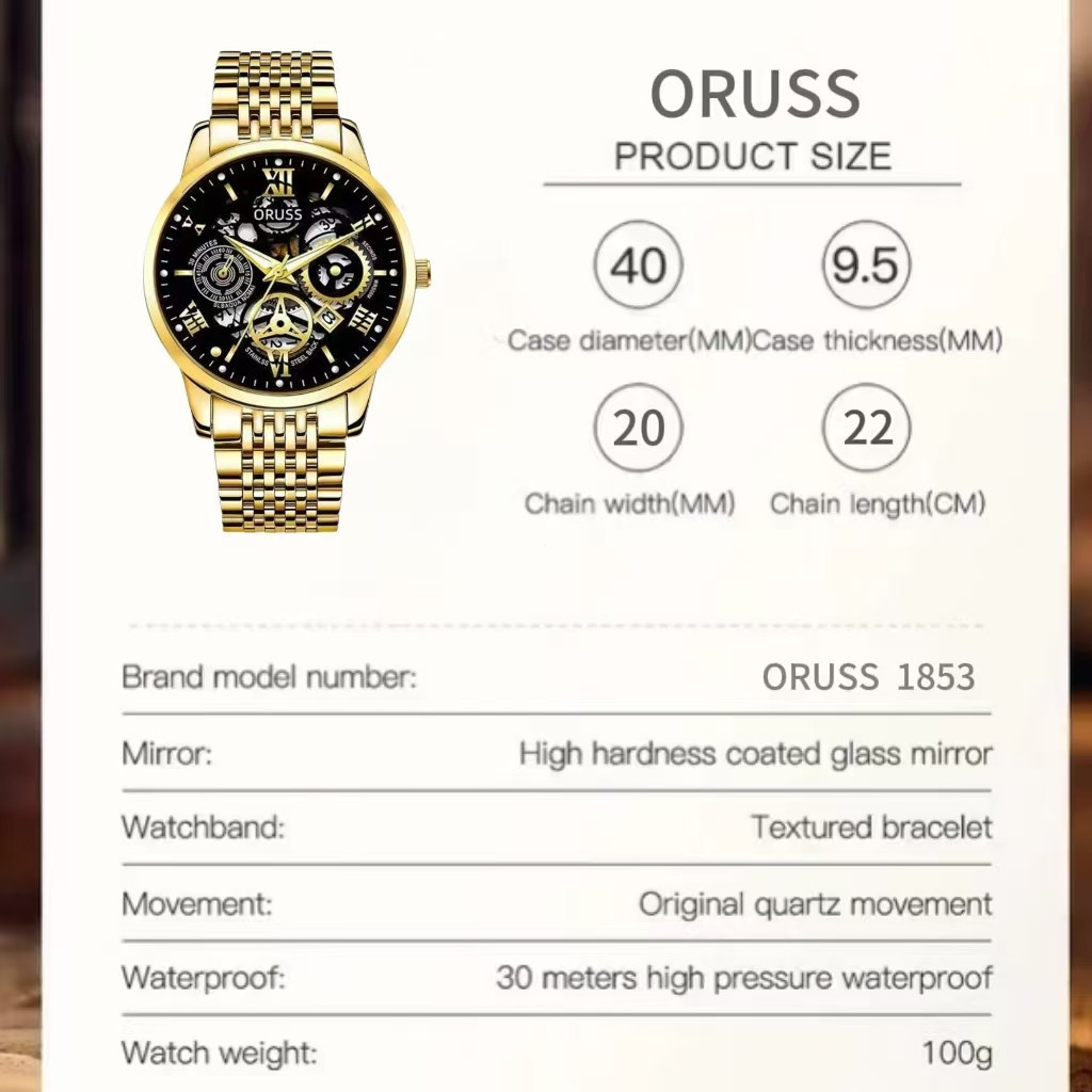ORUSS luxo oco aço inoxidável calendário de ouro luminoso à prova dwaterproof água relógio moda versã GM 615 YD