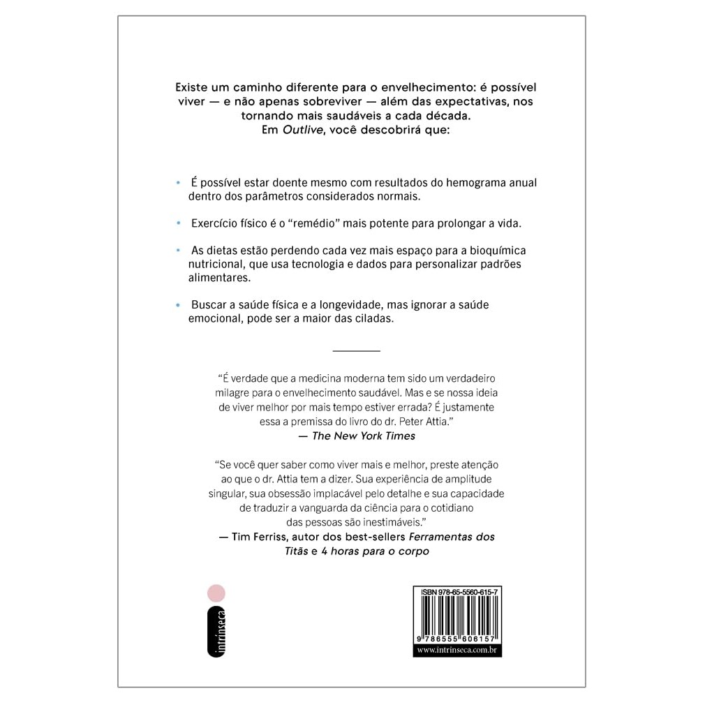 Um dos maiores especialistas mundiais em longevidade, Peter Attia investiga o envelhecimento, o impacto das doenças crônicas e fornece estratégias práticas para melhorar a saúde e prolongar a vida com qualidade. Antes dos 40 anos, Peter Attia, além de médico renomado, já era um maratonista aquático de alto nível, capaz de fazer longas travessias marítimas. Apesar da vida saudável, de repente descobriu que tinha uma doença cardiovascular, para a qual estava absolutamente despreparado. Quando enfim se deu conta do risco que corria, passou a se dedicar ao estudo da longevidade: como e por que morremos, e como podemos retardar ou até mesmo prevenir as principais doenças crônicas fatais, como as cardiovasculares, o câncer, o Alzheimer e a diabetes tipo 2? Neste manifesto inovador, Attia revela como a sua jornada pessoal o fez repensar a abordagem da medicina com a qual ele e tantos outros colegas e pacientes estavam acostumados. Afinal, apesar de todos os seus sucessos, a medicina tradicional parece ter falhado no que diz respeito às doenças relacionadas ao envelhecimento. Quase sempre os tratamentos são excessivamente tardios, focados em prolongar a longevidade em detrimento da saúde ou da qualidade de vida. Attia acredita que é preciso substituir esse modelo ultrapassado por uma estratégia personalizada e proativa, na qual as medidas são tomadas aqui e agora, bem antes dos primeiros sintomas. Com uma abordagem estratégica e científica, Peter Attia lança um novo olhar sobre a longevidade, em busca de saúde física, cognitiva e emocional. Seu objetivo não é ditar regras nem apontar falhas, mas ajudar pessoas a transformar seu modo de pensar a saúde em longo prazo e, assim, criar o melhor plano individualizado possível para viver mais e melhor.