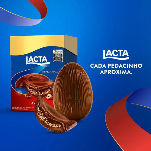 Está chegando a época mais doce do ano e a Lacta preparou um ovo de Páscoa que vai conquistar seu paladar! Com 320g de sabor e crocância, o ovo de chocolate ao leite com recheio de avelã é uma opção irresistível para quem não abre mão de um chocolate de qualidade nesta data tão especial. O recheio cremoso de avelã presente no ovo é uma verdadeira delícia. É impossível resistir a cada mordida que revela um sabor ainda mais intenso. A combinação do chocolate ao leite com avelã é um clássico que agrada a todos os gostos. Além disso, o ovo de Páscoa da Lacta tem um tamanho generoso e é perfeito para compartilhar com a família e amigos. Afinal, a felicidade é ainda maior quando compartilhada! Não perca mais tempo e garanta já o seu ovo de Páscoa de chocolate ao leite com recheio de avelã da Lacta. Aproveite a oportunidade para presentear quem você ama e surpreender com um chocolate de qualidade. Lembre-se de que a Páscoa é uma data muito especial e merece ser comemorada com muito amor e carinho.