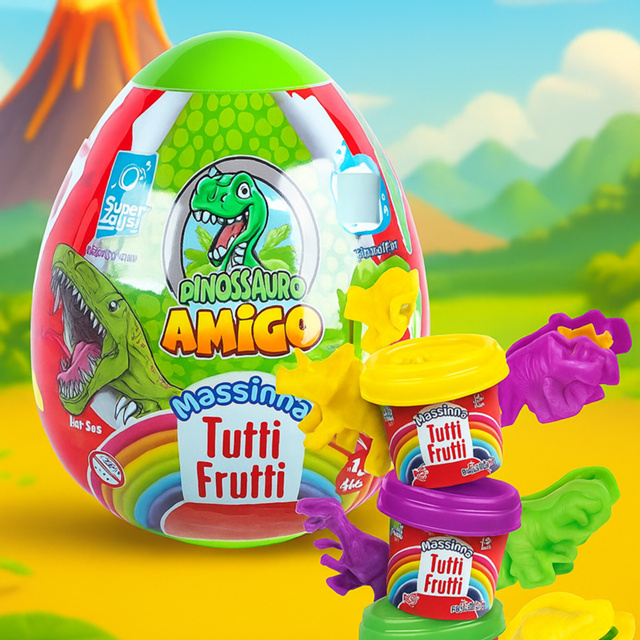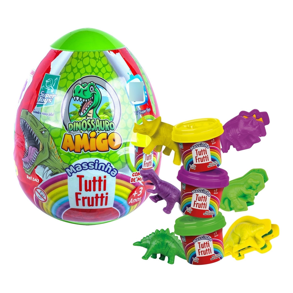 O Ovo do Dinossauro Amigo chegou para deixar as brincadeiras ainda mais criativas e cheias de diversão! Em uma embalagem em formato de ovo de dinossauro, ele guarda massinhas coloridas com delicioso aroma de tutti frutti e moldes de dinossauros, permitindo que as crianças criem e inventem o que a imaginação mandar. Além de garantir momentos de alegria, o brinquedo estimula a criatividade, coordenação motora e imaginação, tornando o aprendizado ainda mais divertido. Ideal para crianças a partir de 3 anos, é uma ótima opção de presente para os pequenos fãs do mundo dos dinossauros. 📋 Ficha Técnica: • Marca: Super Toys • Idade recomendada: +3 anos • Altura: 15,5 cm