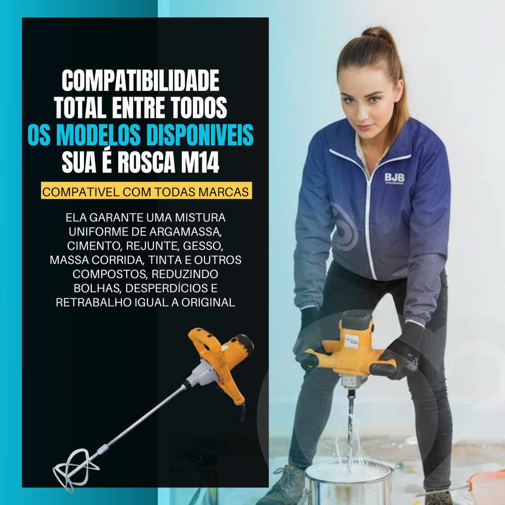 Pá de Misturador Elétrico com Rosca M14 - Ideal para Tintas, Argamassas e Mais Descrição do Produto: Transforme suas tarefas de mistura com a Pá de Misturador Elétrico com Rosca M14. Esta ferramenta é essencial para profissionais e entusiastas que buscam eficiência e precisão na mistura de materiais como tintas, argamassas, rejuntes e outros compostos líquidos ou pastosos. Características: Rosca M14: Compatível com a maioria das furadeiras e misturadores elétricos do mercado.Material Resistente: Fabricada em aço de alta qualidade, garantindo durabilidade e resistência ao desgaste.Design Ergonômico: Sua estrutura foi projetada para proporcionar uma mistura homogênea e sem esforço.Uso Versátil: Perfeita para misturar tintas, argamassas, cimento, gesso, entre outros.